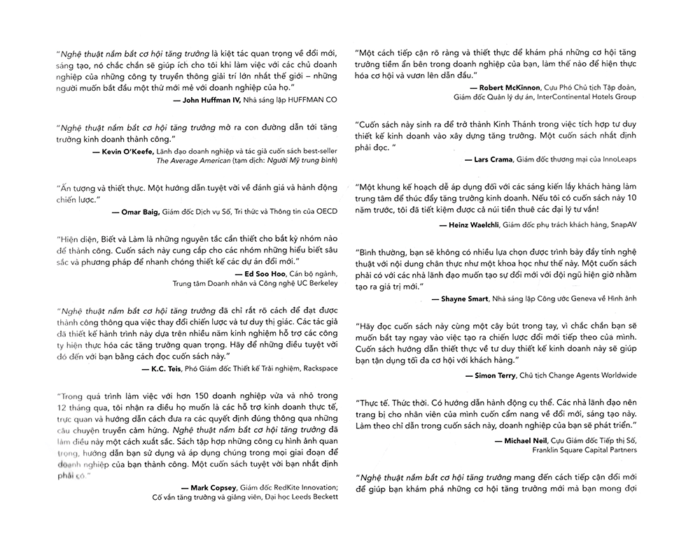 Khám phá và đầu tư vào những cơ hội tăng trưởng chưa bao giờ là bài toán dễ giải, đặc biệt là với các tổ chức đã hoạt động ổn định, bị bó hẹp trong lối tư duy lỗi thời hoặc các mô hình kinh doanh truyền thống. Nghệ thuật nắm bắt cơ hội tăng trưởng sẽ cung cấp cho bạn một lộ trình ngắn nhất để nhận diện, thiết kế và ra mắt các sáng kiến tăng trưởng chiến lược. Marc, Parker và Matt đã xây dựng một hành trình hấp dẫn, nội dung phong phú dành cho bất kỳ ai theo đuổi mục tiêu tăng trưởng mới. Và trong quá trình giới thiệu những cách tư duy mới về chiến lược tăng trưởng và đổi mới chiến lược, ví dụ như nội dung về nhóm phi khách hàng, bản chất nhu cầu của khách hàng cùng các thành tố tạo nên mô hình kinh doanh và mô hình doanh thu, họ cũng giới thiệu với chúng ta những cách làm việc mới. Phương pháp tư duy thị giác và các nguyên tắc tư duy thiết kế kinh doanh khác được thể hiện xuyên suốt cuốn sách sẽ giúp bạn cải thiện cách tiếp cận vấn đề thiết kế và thực hiện chiến lược để phát triển hoạt động kinh doanh tăng trưởng mới. Với sự hỗ trợ của hình ảnh, các công cụ và biểu mẫu, bạn sẽ áp dụng phương pháp này theo đúng nhu cầu của mình. Cuốn sách chia làm 5 chương, giúp từng bước hiểu và xây dựng được cho mình một chiến lược tăng trưởng kiểu mới: Chương 1: Giúp bạn hiểu Chiến lược đổi mới là gì đặt trong sự đối sánh với chiến lược kiểu truyền thống; và 5 nguyên tắc quan trọng của tư duy thiết kế kinh doanh. Đây là những câu hỏi căn bản để bạn thực sự bước chân vào lãnh địa đổi mới chiến lược. Chương 2: Giúp bạn khám phá các cơ hội tăng trưởng kiểu mới bằng việc hiểu rõ nhóm khách hàng và phi khách hàng. Điều quan trọng không kém là hiểu về chính doanh nghiệp của bạn. Từ đó xây dựng khung làm việc cho các sáng kiến và cơ hội tăng trưởng kiểu mới. Chương 3 : Giúp bạn bắt tay vào thiết kế bản chiến lược. Cụ thể là thiết kế chính sản phẩm mà bạn chào bán, xác định mô hình kinh doanh và mô hình doanh thu cho doanh nghiệp mình. Từ đó xác lập chiến lược tăng trưởng cụ thể bằng cách tạo giá trị cho khách hàng, doanh nghiệp và hệ sinh thái. Thể hiện chiến lược dưới dạng hình ảnh cũng là một nghệ thuật cần được quan tâm. Chương 4 : Đi sâu vào 3 giai đoạn thử nghiệm và ra mắt hoạt động kinh doanh tăng trưởng, bao gồm : khởi đầu, phát triển và mở rộng. Chương 5 : Giúp bạn làm chủ nghệ thuật nắm bắt cơ hội tăng trưởng bằng tư duy thiết kế kinh doanh. 5 nguyên tắc của tư duy thiết kế kinh doanh sẽ được làm rõ bằng các dẫn chứng và ví dụ minh họa. Mỗi chương đều có phần hoạt động dành cho các nhóm trong doanh nghiệp để thực hành lý thuyết. Kèm với đó là các doanh nghiệp truyền cảm hứng như Microsoft, Oracle, ProSiebenSat.1, Fahrenheit 212, Câu chuyện của họ thực sự là những bài học hữu ích cho các doanh nghiệp đang cố gắng đổi mới chiến lược tăng trưởng .