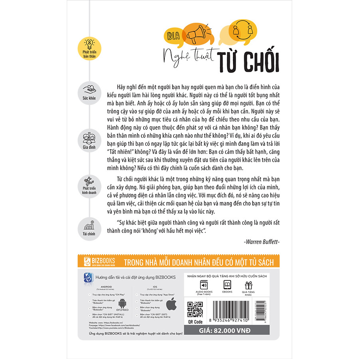 Bí quyết đưa ra lời Từ chối mà không làm tổn hại các mối quan hệ nằm “Nghệ Thuật Từ Chối – Cách Nói Không Mà Vẫn Có Được Đồng Thuận” giúp bạn tìm hiểu nguyên nhân và đưa ra cách từ chối “nhẹ nhàng”. Cuốn sách chia quy trình Từ chối thành những bước như- Chuẩn bị từ chối, đưa ra từ chối và hoàn tất từ chối - cuốn sách hướng dẫn bạn phương pháp nói Không hiệu quả, mạnh mẽ nhất, bạn có thể thực hiện ngay trong đời sống, công việc và các mối quan hệ.
