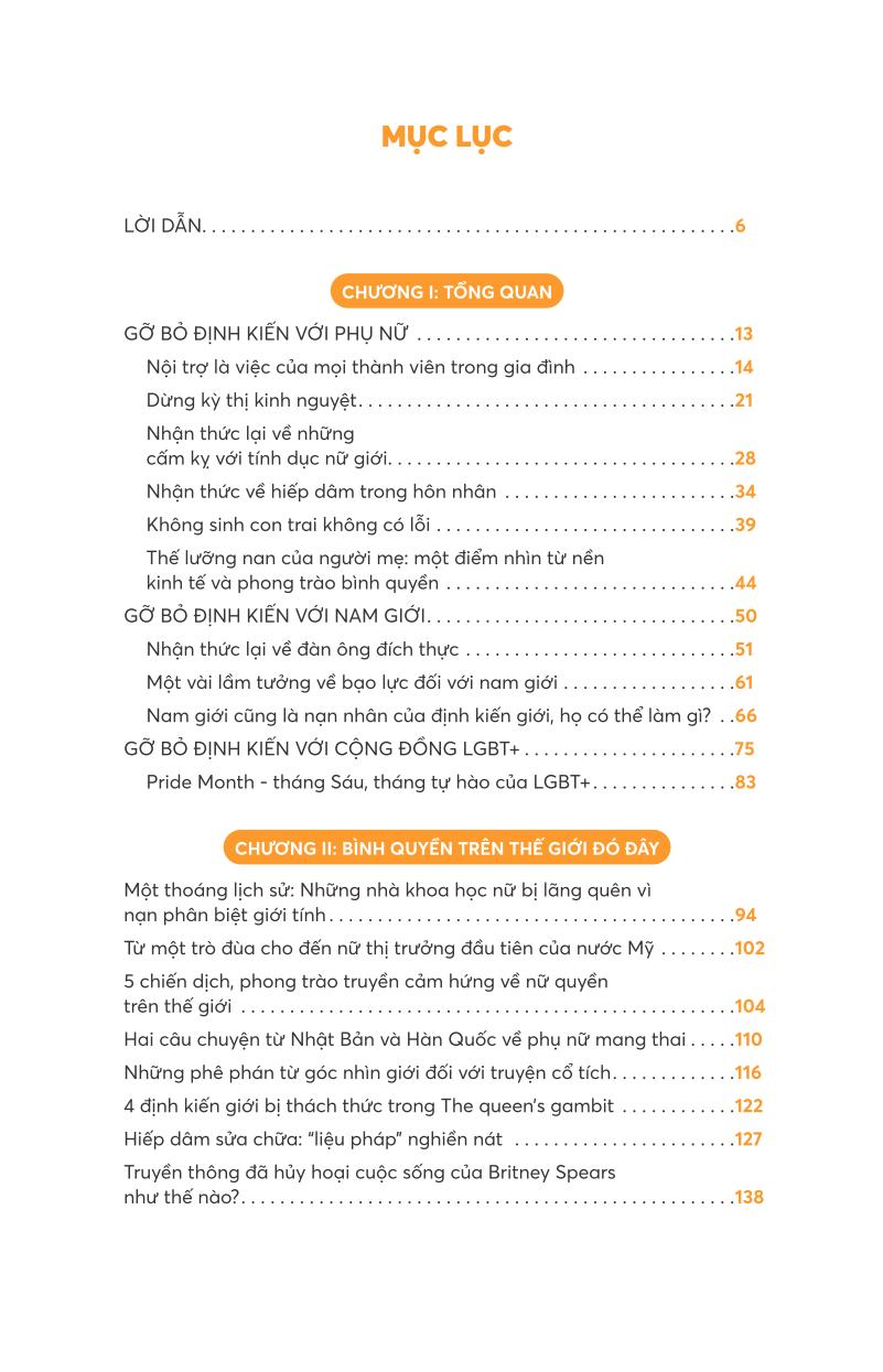 Bạn có biết, định kiến giới là một trong những thứ định kiến lâu đời nhất, dai dẳng nhất, và để lại nhiều hệ lụy nhất? Không chỉ ở Việt Nam mà trên khắp thế giới, định kiến giới vẫn từng ngày len lỏi trong mọi ngóc ngách cuộc sống, vờn bóng đen lên mỗi suy nghĩ, lời nói, hành vi của chúng ta, âm thẩm gây thương tổn cho những người quanh ta? Nhằm mục đích thúc đẩy nhận thức về bình đẳng giới, khuyến khích mỗi cá nhân và cả xã hội vượt qua những định kiến giới, Nghĩ bình đẳng, sống bình đẳng là thành quả sau nhiều năm hoạt động bền bỉ của dự án Nhà Nhiều Cột. Cuốn sách giới thiệu và cập nhật những kiến thức đa dạng, hiện đại về giới và bình đẳng giới, cung cấp tri thức nền tảng về vấn đề giới. Cùng với đó, những phân tích, bình luận về các sự kiện thực tế nóng hổi trên báo chí đương đại cũng có ý nghĩa quan trọng trong việc nhận diện, phê phán các hiện tượng bất bình đẳng giới đang tồn tại. Nhận diện đúng và hiểu đúng về giới, chúng ta sẽ tiệm cận hơn với việc thực hành đúng theo tinh thần bình đẳng giới, góp phần kiến tạo một xã hội tốt đẹp, văn minh và tử tế hơn. NHÀ NHIỀU CỘT Chiến dịch #NhàNhiềuCột nhằm thay đổi nhận thức và hành vi của người trẻ đối với các định kiến giới và thay đổi các sản phẩm quảng cáo để hướng tới mục tiêu bình đẳng giới. Chiến dịch được thực hiện bởi Tổ chức CARE Quốc tế tại Việt Nam và TUVA Communication, với nguồn tài trợ của Investing in Women, một sáng kiến của Chính phủ Australia. Sách được Sakedemy hỗ trợ thực hiện.