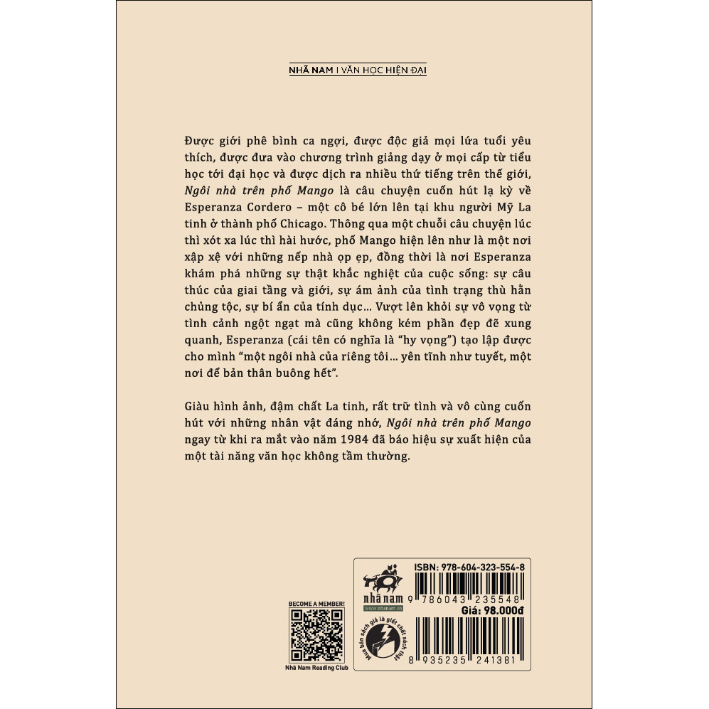 Được giới phê bình ca ngợi, được độc giả mọi lứa tuổi yêu thích, được đưa vào chương trình giảng dạy ở mọi cấp từ tiểu học tới đại học và được dịch ra nhiều thứ tiếng trên thế giới, Ngôi nhà trên phố Mango là câu chuyện cuốn hút lạ kỳ về Esperanza Cordero – một cô bé lớn lên tại khu người Mỹ Latinh ở thành phố Chicago.