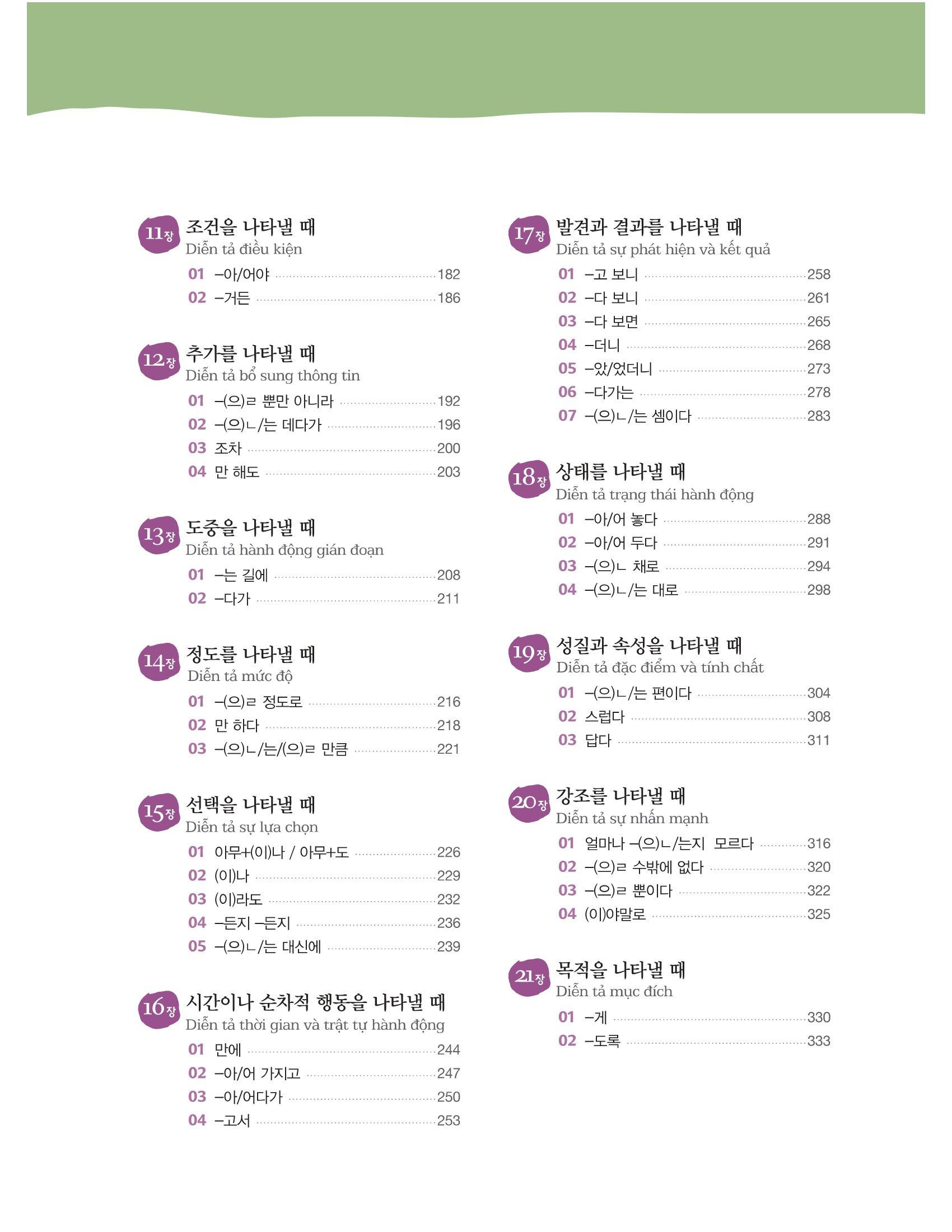 • Cuốn sách giúp các bạn hệ thống nhiều chủ điểm ngữ pháp và cấu trúc ở trình độ trung cấp thông qua 26 bài học. Mỗi bài học đi từ: Dẫn nhập -> Tìm hiểu ngữ pháp -> Tìm hiểu thêm -> Phân biệt -> Tạo hội thoại -> Luyện tập -> kiểm tra. Các bạn đang tự học hoàn toàn có thể tiếp thu bài học với các trình bày khoa học này.