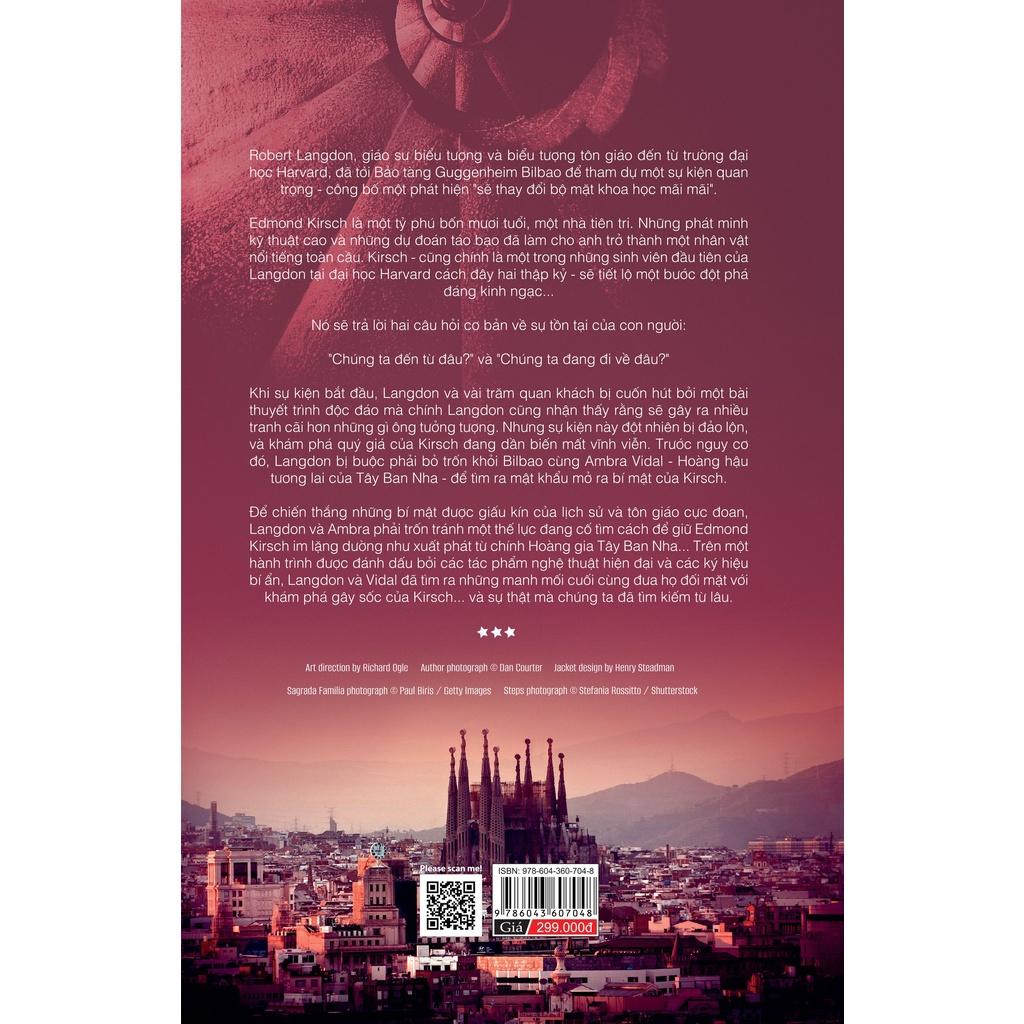 Để chiến thắng những bí mật được giấu kín của lịch sử và tôn giáo cực đoan, Langdon và Ambra phải trốn tránh một thế lực với sức mạnh dường như xuất phát từ chính Hoàng gia Tây Ban N và đang cố tìm cách để giữ Edmond Kirsch im lặng. Trên một hành trình được đánh dấu bởi các tác phẩm nghệ thuật hiện đại và các ký hiệu bí ẩn, Langdon và Vidal đã tìm ra những manh mối cuối cùng đưa họ đối mặt với khám phá gây sốc của K và sự thật mà từ lâu chúng ta đã tìm kiếm."