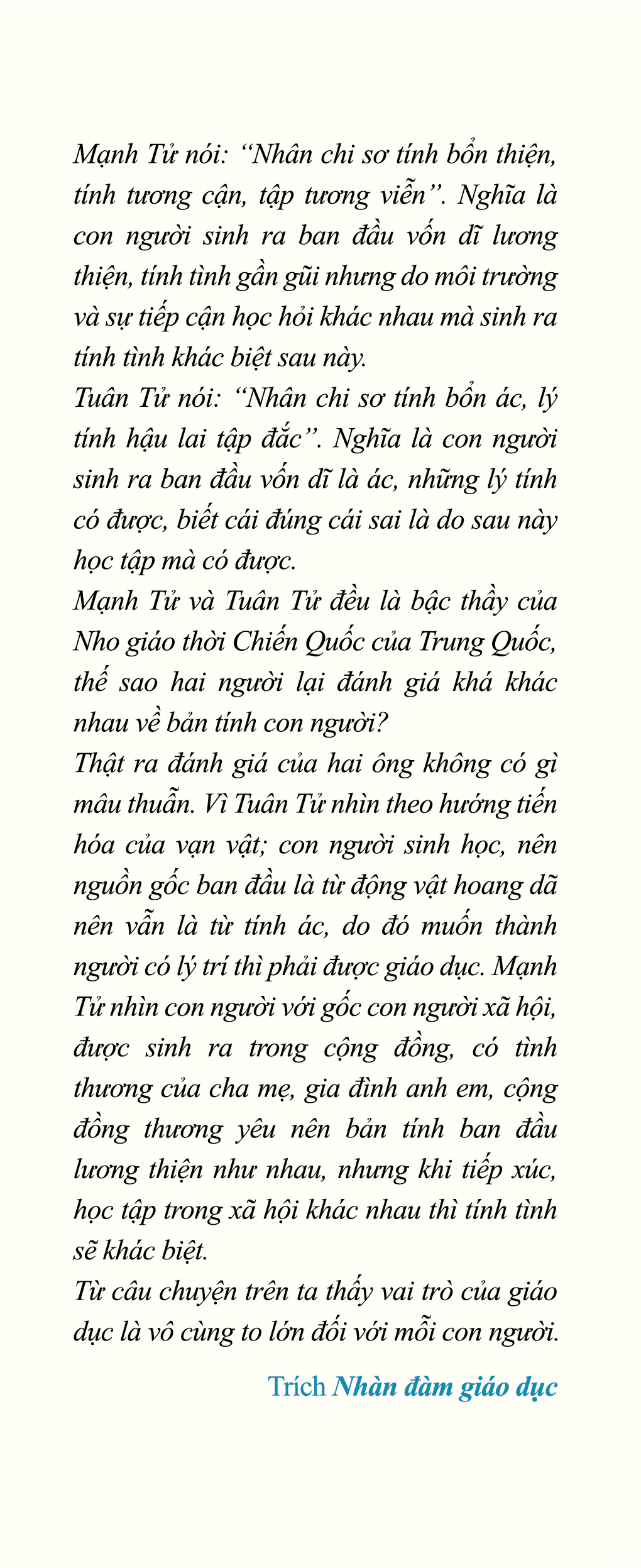 Là một người mà “từ nhỏ đến lớn chỉ ôm ấp một mơ ước là được làm thầy giáo” và đã thật sự làm một thầy giáo dạy vật lý, nhưng rồi những biến động thời cuộc lại đưa đẩy tác giả Phan Chánh Dưỡng sang con đường làm kinh tế, đúng vào những đêm dài trước đổi mới. Tuy vậy, những suy tư trăn trở của ông về vấn đề giáo dục một đứa trẻ nói riêng đến ngành giáo dục nước nhà nói chung đã được thể hiện trọn vẹn trong cuốn sách này. Từ chính sự quan sát, trải nghiệm của bản thân, chuyên gia Phan Chánh Dưỡng đã khái quát về vai trò của từng yếu tố gia đình, nhà trường, xã hội và bản thân mỗi người tới quá trình giáo dục hoàn thiện một con người. Cuốn sách cũng tập hợp một số bài viết của ông từ những năm 1981 đến 2003 thể hiện những quan điểm về ngành giáo dục nước nhà.