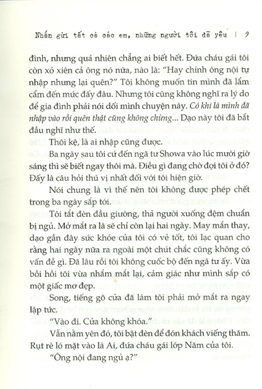 Bảy mươi ba tuổi. Có thể đó là độ tuổi còn hơi sớm để chết, nhưng kỳ lạ thay, tôi không sợ hãi hay bất mãn gì cả. Trong ngôi nhà lớn, có người vợ yêu dấu, có đứa con trai đáng tin cậy, có đứa con dâu dịu hiền, còn có cả đứa cháu gái dễ thương quây quần bên mình lúc về già. Dù ngày mai con tim này có ngừng đập trong đau đớn đi nữa, nếu như có gia đình ở bên thì tôi nghĩ mình sẽ qua đời với một nụ cười trên môi. Vì đây đã là một cuộc đời quá hạnh phúc rồi.