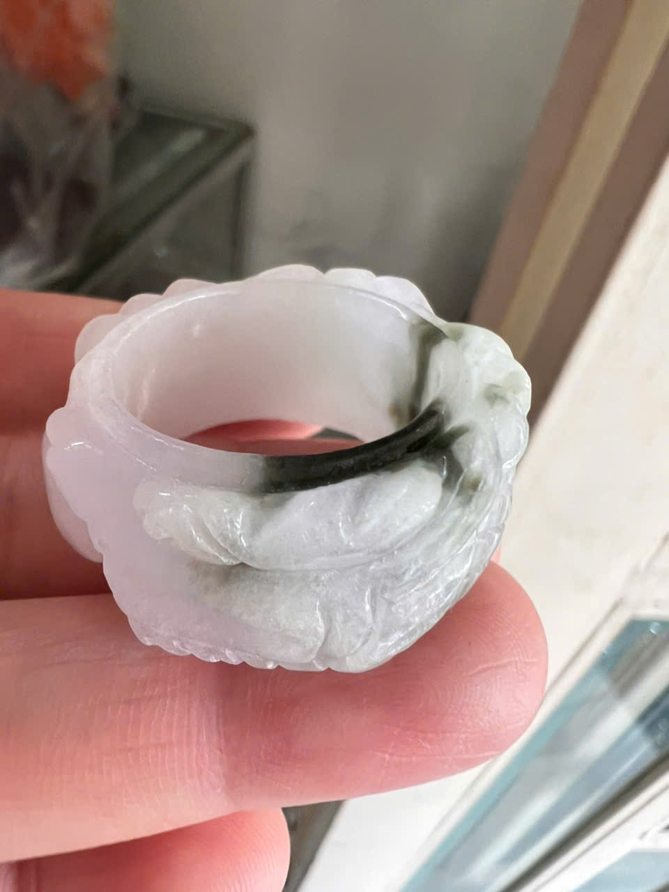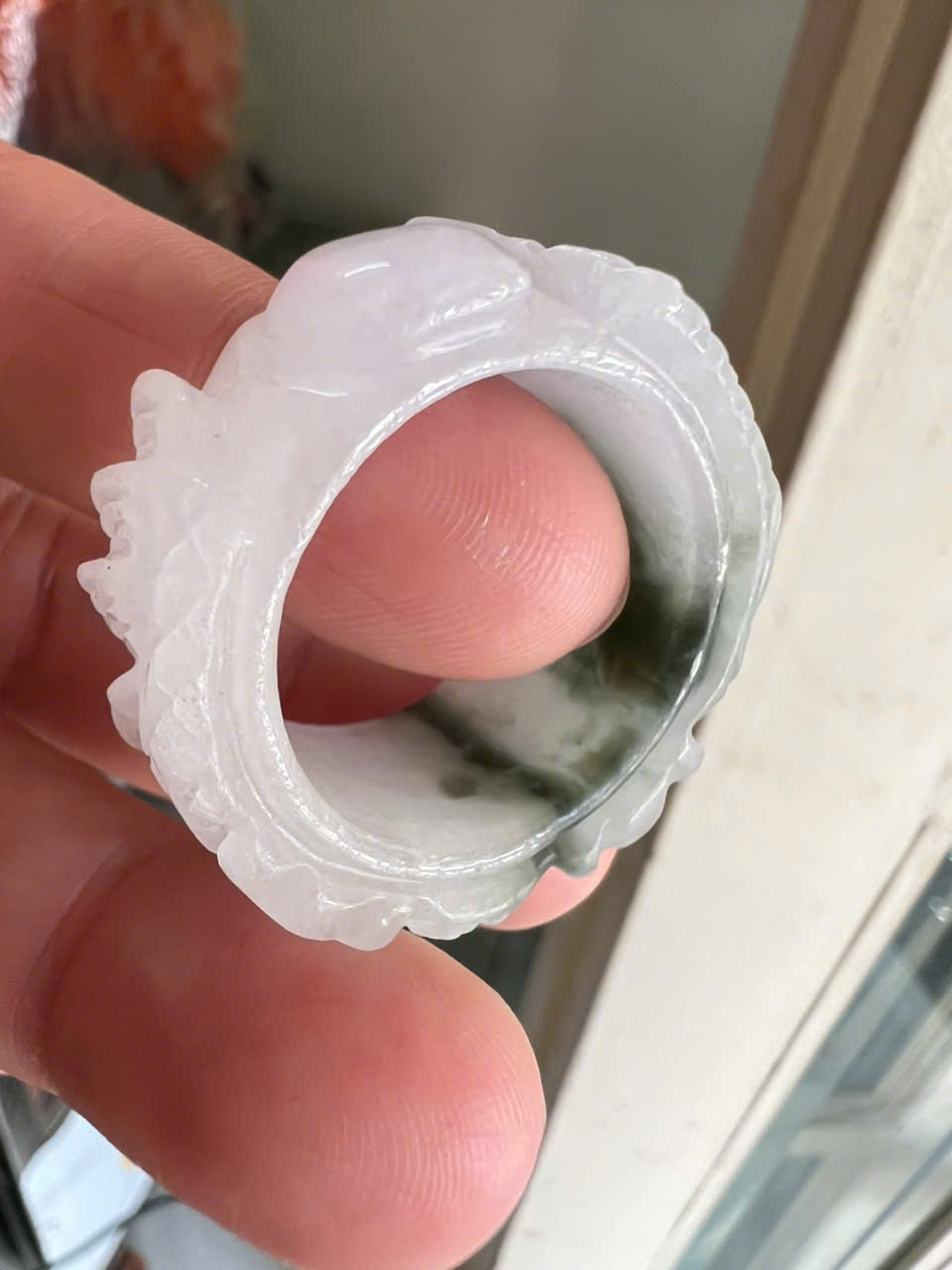 Nhẫn Rồng Nam Ni 21mm Cao 13mm Dầy 6mm Đá Cẩm Thạch màu màu trắng sáng bóng điểm xíu xanh đẹp ạ