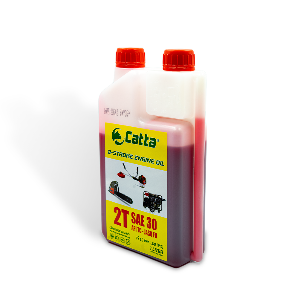 Nhớt 2 thì máy cắt cỏ, xipo, cưa xích, máy phát điện pha xăng 1 lít CATTA - Nhớt 2 thì pha xăng CATTA GIỚI THIỆU CATTA 2 STROKE ENGINE OIL (CATTA 2T) là sản phẩm nhớt 2 thì pha xăng chuyên dành cho động cơ 2 thì, thích hợp sử dụng cho các loại máy cưa, máy cắt cỏ, máy phun thuốc, xe máy 2 thì và động cơ 2 thì khác… Công thức đặc biệt giúp nhớt 2 thì CATTA bôi trơn các bộ phận quan trọng của động cơ, kéo dài tuổi thọ của bugi, phụ gia đặc biệt chống gỉ sét và ăn mòn động cơ. Đặc biệt, nhớt 2 thì CATTA giúp tản nhiệt, làm mát hiệu quả khi động cơ vận hành. Sản phẩm nhớt 2 thì Catta được sản xuất từ nguyên liệu nhập khẩu hoàn toàn trên dây chuyền công nghệ hiện đại, đội ngũ kỹ thuật tận tâm và nhà máy đạt chứng nhận ISO 9001:2018. Tỷ lệ pha: 1:50 (2%). Tiêu chuẩn quốc tế đáp ứng: