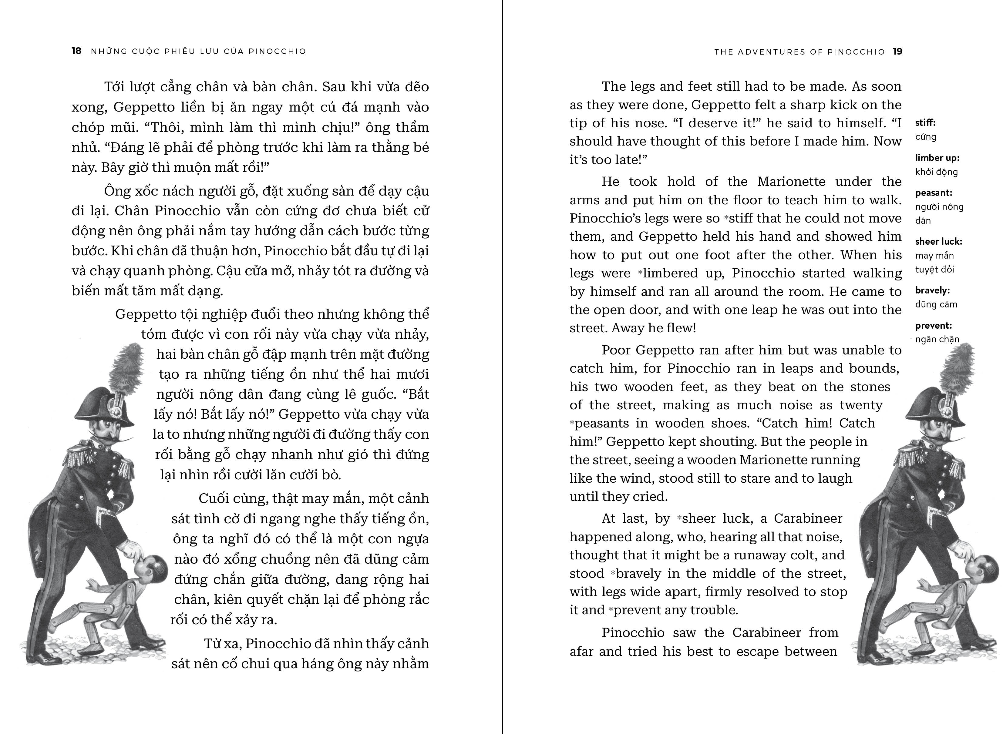 • Đây cũng là phiên bản Những cuộc phiêu lưu của Pinocchio song ngữ Anh-Việt duy nhất có kết hợp từ vựng giúp các em nhỏ học tiếng Anh, giải trí, tăng vốn từ qua tác phẩm đậm chất nhân văn này, giúp nuôi dưỡng và rèn luyện trí thông mình cảm xúc (EQ) và cảm nhận tác phẩm kinh điển này bằng cả hai thứ tiếng.