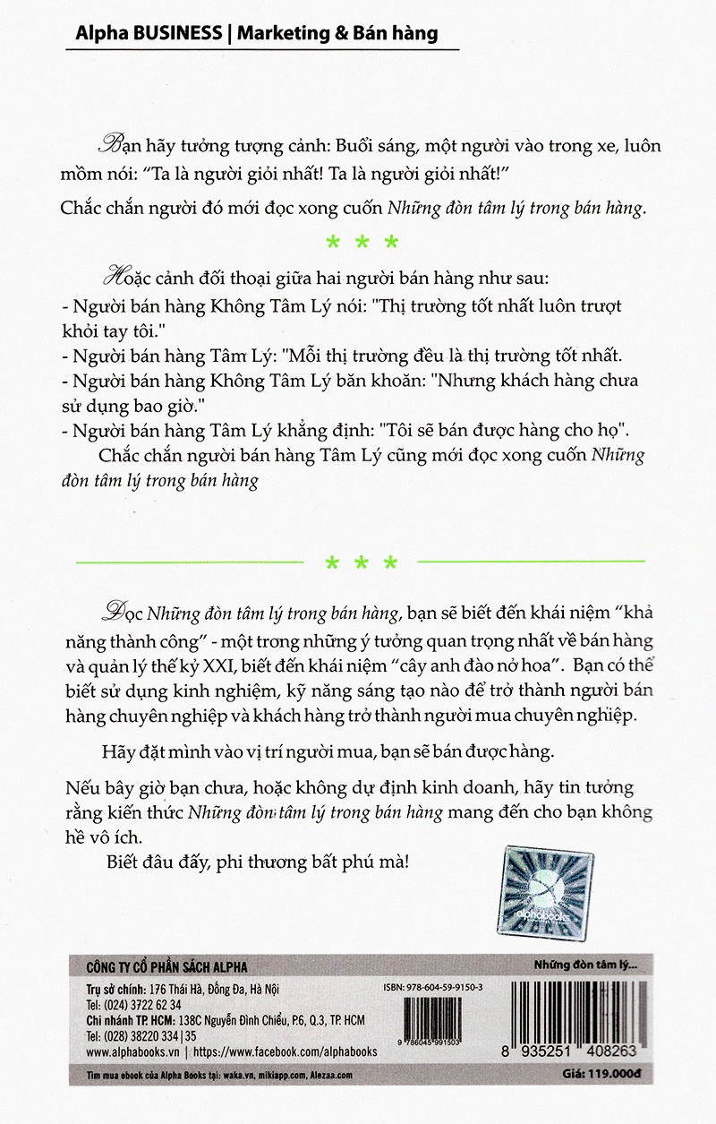 Đọc Những đòn tâm lý trong bán hàng, bạn sẽ biết đến khái niệm "khả năng thành công" - một trong những ý tưởng quan trọng nhất về bán hàng và quản lý thế kỷ 21, biết đến khái niệm "cây anh đào nở hoa", hoặc bạn cần sử dụng kinh nghiệm, kỹ năng sáng tạo nào để bạn trở thành người bán hàng chuyên nghiệp và khách hàng cũng thành người mua chuyên nghiệp.