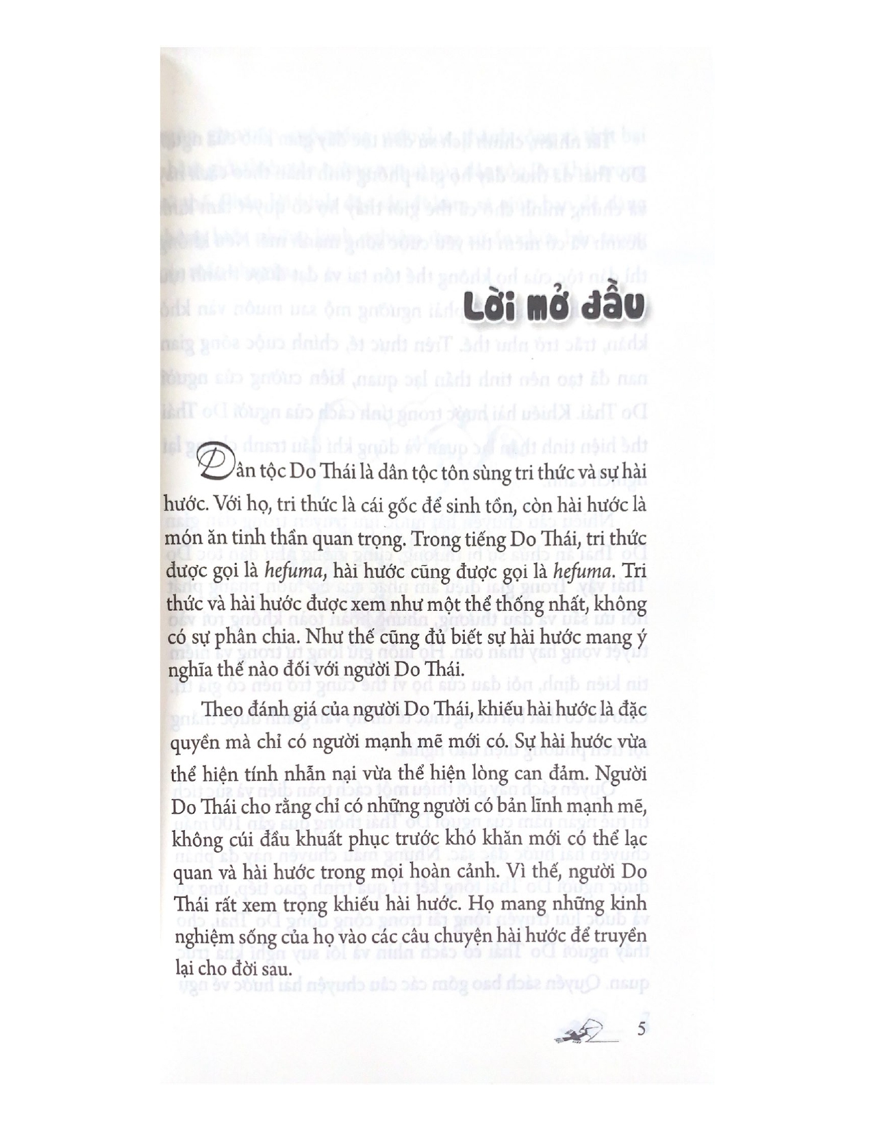 - Giới thiệu Những Mẫu Chuyện Hài Hước Trong Xử Thế Của Người Do Thái Dân tộc Do Thái không những là một dân tộc khôn ngoan, có đầu óc kinh doanh nhạy bén mà còn có khiếu hài hước. Văn hóa xử thế của họ được thể hiện hàm súc trong các chuyện cười dân gian. Nghiên cứu tính hài hước của người Do Thái cũng chính là khám phá nghệ thuật giao tiếp, ứng xử của họ. “Những mẩu chuyện hài hước trong xử thế của người Do Thái” phản ánh nền văn hóa hàng nghìn năm của dân tộc Do Thái. Gần 100 mẩu chuyện đặc sắc là gần 100 tiếng cười ở nhiều phương diện khác nhau: giao tiếp, giáo dục, cuộc số Những lời bình đi kèm sẽ giúp bạn gợi mở nhiều suy nghĩ và nhận ra được ý nghĩa sâu xa mà từng mẩu chuyện gửi gắm. Hy vọng rằng bạn sẽ có những giây phút thư giãn tuyệt vời và nghiệm ra được nhiều bài học thú vị từ những mẩu chuyện được góp nhặt trong sách, từ đó có cái nhìn lạc quan hơn về con người và cuộc sống.