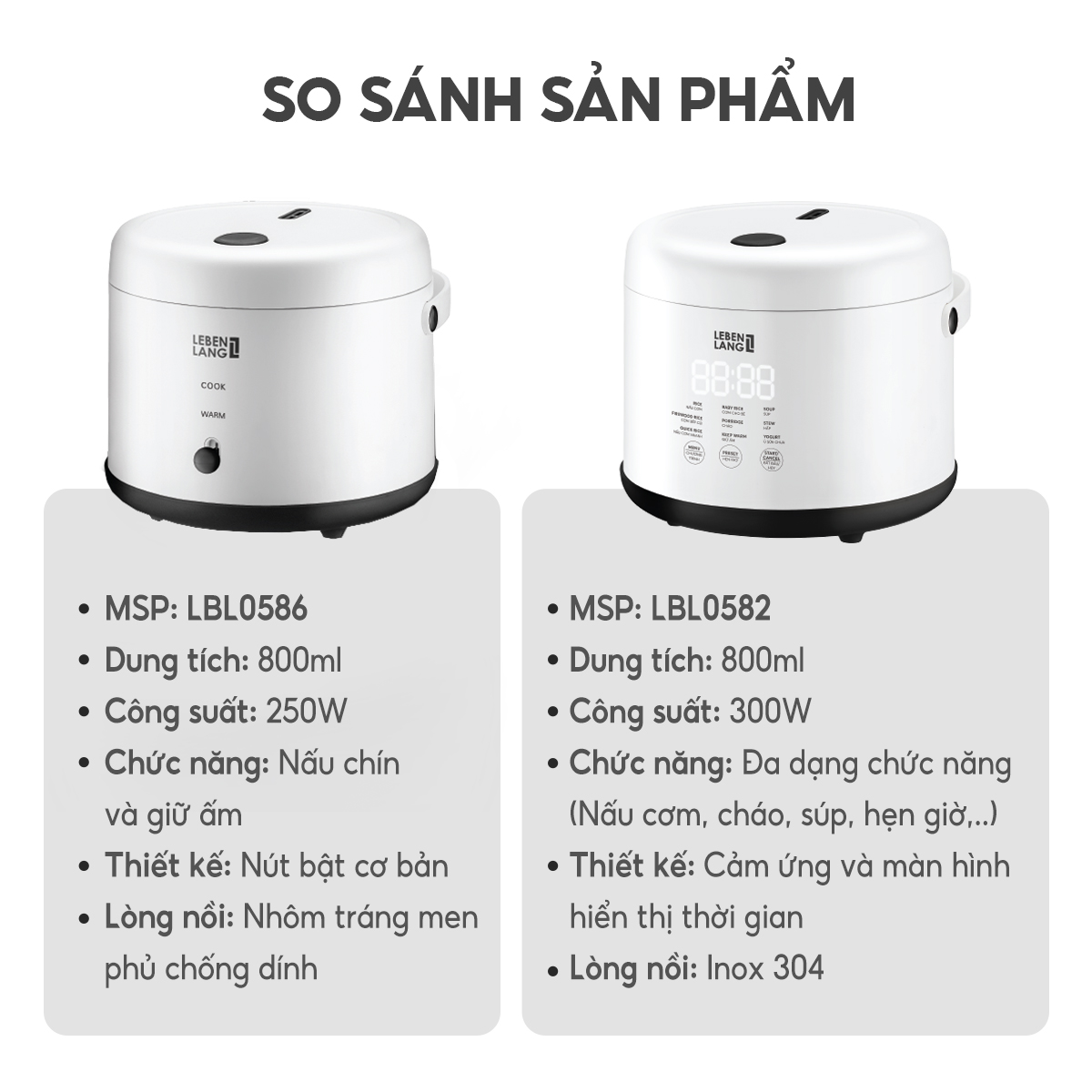- Hiệu Suất Cao: Nồi cơm điện tử Lebenlang Công suất 300W, tối ưu hóa thời gian nấu và tiêu thụ điện