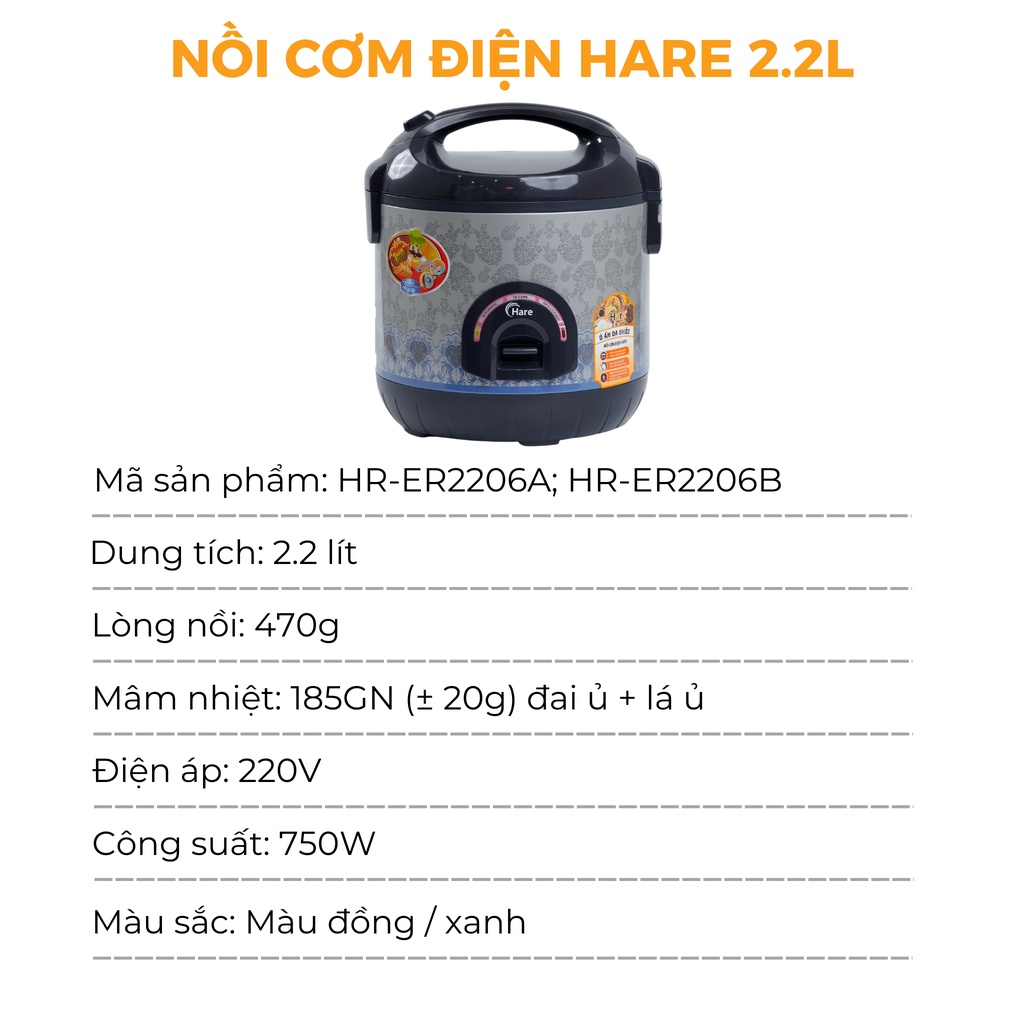 Thông số kỹ thuật: Tên sản phẩm: Nồi cơm điện HR-RC1006 (1L) chống dính PFLUON Thương hiệu: Hare Mã sản phẩm: HR-RC1006 Màu sắc: Vàng đồng Điện áp định mức: 220V Công suất: 400W Dung