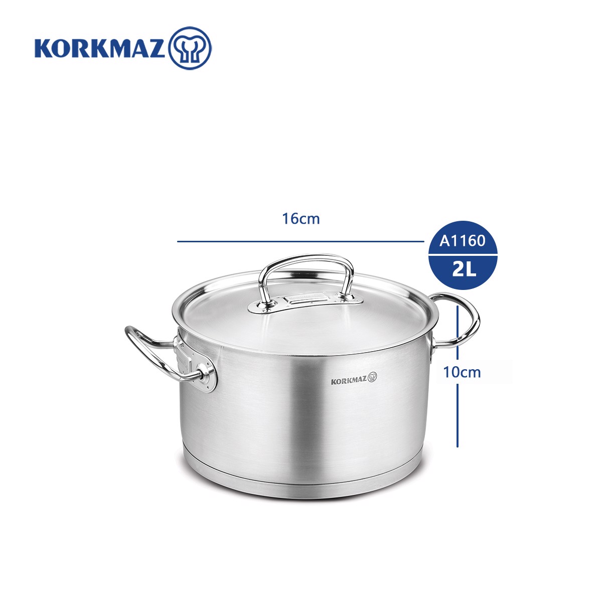 Nồi inox cao cấp Korkmaz Proline 2 lít - A1160 (nắp inox) là dòng nồi inox cao cấp 18/10 của thương hiệu Korkmaz, được sản xuất 100% tại Thổ Nhĩ Kỳ với dòng chữ Made in Turkey dập dưới đáy mỗi chiếc nồi.