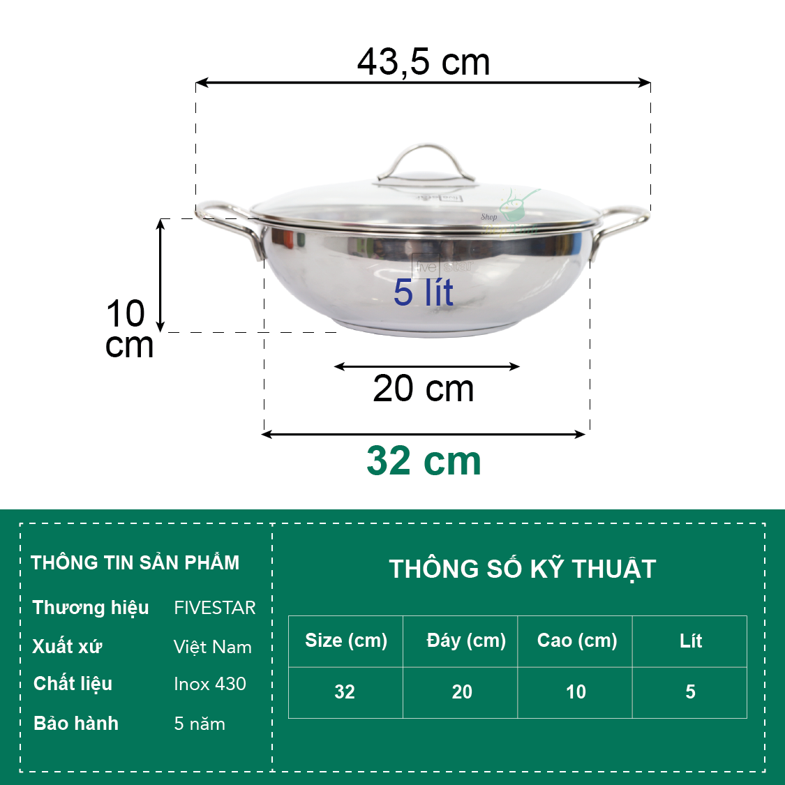 Nồi lẩu um xào inox 430 bếp từ 3 đáy Fivestar nắp kính ( 24cm / 26cm / 28cm ) NỒI LẨU INOX 32CM : – Thiết kế theo công nghệ hiện đại, kiểu dáng