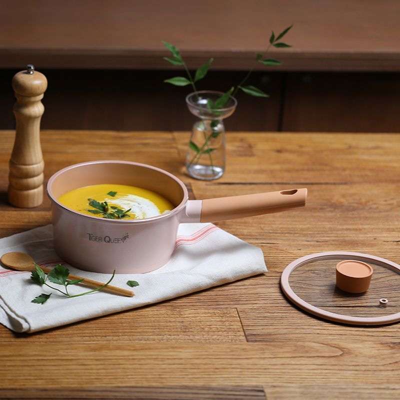 Nồi quánh Ceramic từ tính cao cấp hiệu Tiger Queen Series Lima 3 lớp kim loại được phủ 2 lớp gốm Ceramic thân dầy 2.5mm chống dính và đáy 9 lớp dầy 3.5mm, chống trầy xước màu hồng hoa anh đào với công nghệ tráng men hiện đại nhất "Hard Anodized" không tróc men, chống gỉ sét, chống ăn mòn, giữ và gia nhiệt lâu hơn giúp thức ăn mau chín tiết kiệm thời gian và nhiên liệu, thiết kế nắp thủy tinh chịu nhiệt chống trào, tay cầm dài chống nóng, sử dụng trên bếp gas, bếp hồng ngoại, bếp từ và máy rửa chén, gồm 02 món (1 nồi quánh và 1 nắp thủy tinh 18cm).