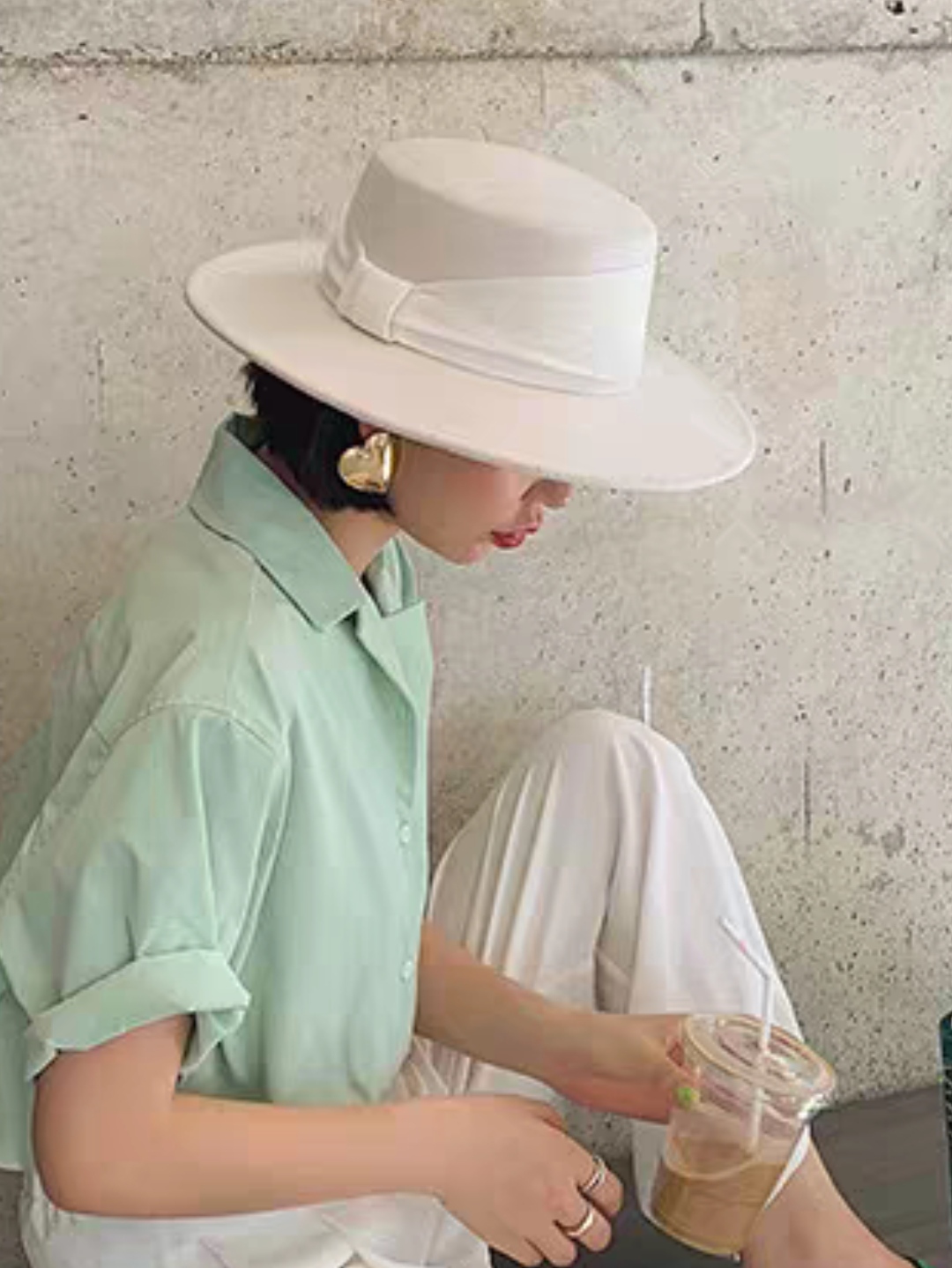 ✨Nón cao bồi vành bằng mũ rộng vành nỉ dạ phối đai trắng thời trang Hàn Quốc dona24080801