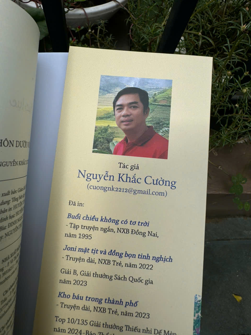 Tác giả Nguyễn Khắc Cường từng nhận giải B Giải thưởng Sách Quốc gia năm 2023 với tác phẩm Joni mặt tịt và đồng bọn tinh nghịch. Một cuốn khác của anh - Kho báu trong thành phố - nằm trong top 10 chung khảo Giải thưởng Dế mèn lần 5 –2024. Nụ hôn dưới vòm cây vẫn giữ lối viết quen thuộc của anh: Tinh tế, hóm hỉnh, lồng ghép khéo léo những hình ảnh về tuổi teen ngày nay nhờ khả năng quan sát và kể chuyện tài tình, và truyền tải một thông điệp sống tích cực.