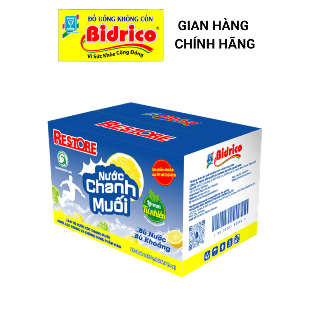 Nước Chanh Muối Restore ( Thùng 24 chai 495ml ) - Sản phẩm của Bidrico Đã khát và sảng khoái Nước chanh muối Restore 495ml vinh dự là sản phẩm chủ lực Tp.Hồ Chí Minh giai đoạn 2018-2020 và 2021-2025. Đồng thời là sản phẩm, dịch vụ tiêu biểu TP.HCM năm 2017 – 2023 và Sản phẩm công nghiệp và công nghiệp hỗ trợ tiêu biểu TP.HCM năm 2022 – 2023. Thông tin sản phẩm: