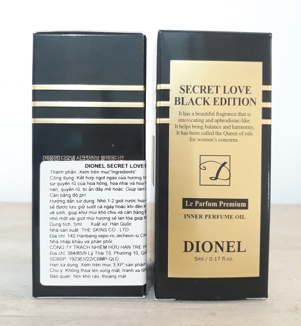 Nước Hoa Vùng Kín Dionel Secret Love Black Edition Inner Parfume Oil Thương hiệu: Dionel Xuất xứ: Hàn Quốc Dung tích: 5ml Black Edition: Hương hoa cam, lan Nam Phi, cam đào và sự quyến rũ của hoa hồng, hoa nhài và hoa mộc lan.