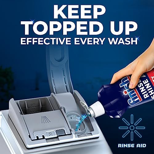 Finish Shine & Rinse Aid mang lại độ sáng bóng rạng rỡ trên kính và bát đĩa, đồng thời ngăn ngừa các giọt nước, vết bẩn và vệt.