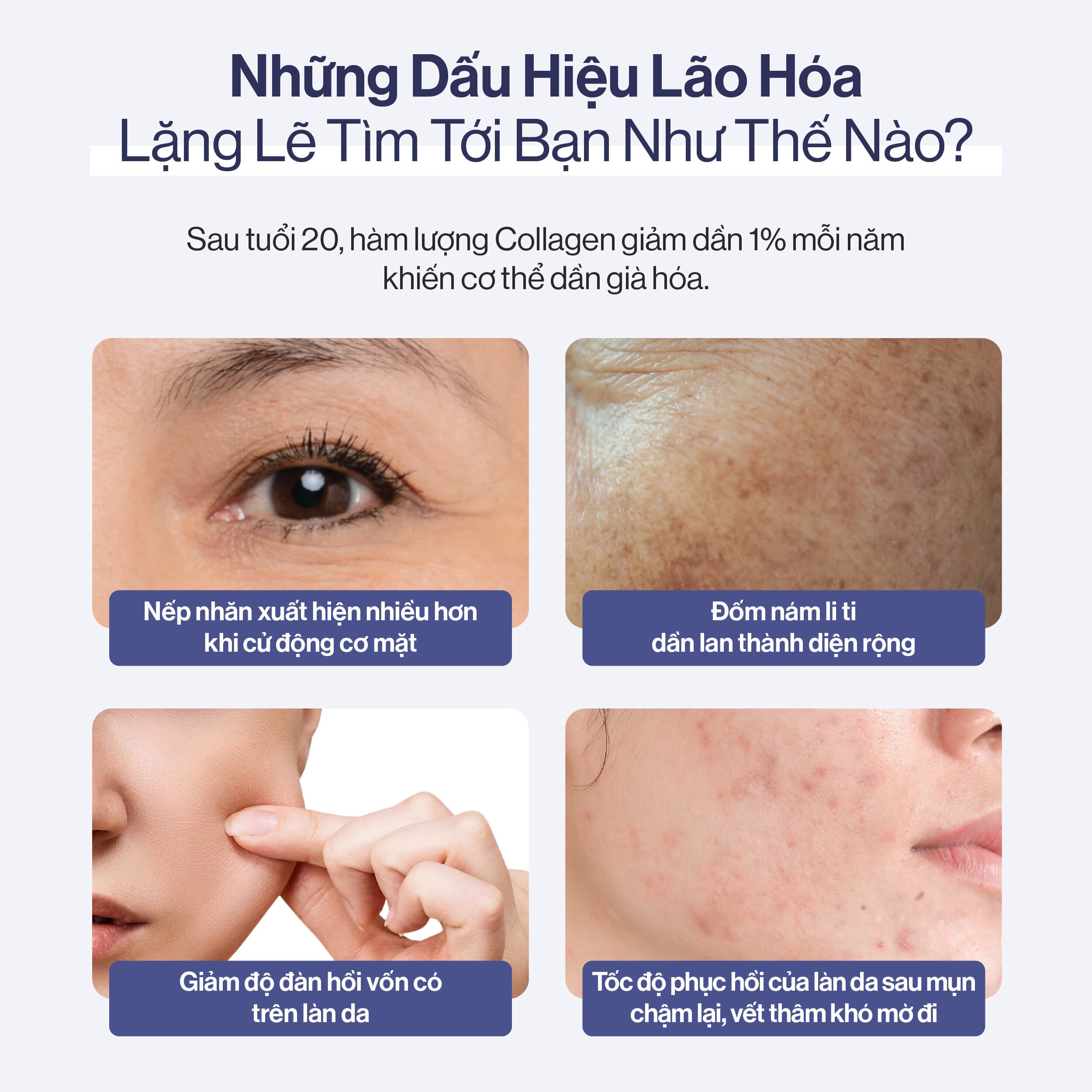 THÔNG TIN SẢN PHẨM Công dụng Cải thiện các dấu hiệu của tuổi tác, củng cố cấu trúc làn da, giảm nếp nhăn và tình trạng chảy xệ Cân bằng nội tiết, hỗ trợ giảm mụn và phục hồi làn da căng mịn Lưu ý: Sản phẩm này không phải là thuốc và không có tác dụng thay thế thuốc chữa bệnh Thành phần 5000mg Collagen Siêu Phân Tử: có khối lượng siêu nhỏ dưới 300Da, tăng khả năng hấp thụ vào cơ thể gấp 200 lần và đẩy nhanh hiệu quả trẻ hóa da Peony: Cân bằng nội tiết, hỗ trợ giảm mụn và phục hồi làn da căng mịn Elastin và HA: tăng độ đàn hồi và giữ da luôn săn chắc, ẩm mượt **Hướng dẫn sử dụng