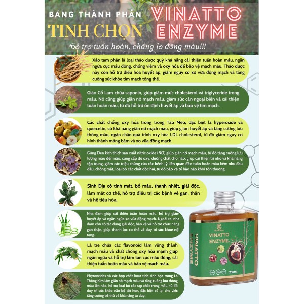 - Nước uống Vinatto Enzyme Là sản phẩm bảo vệ sức khỏe toàn diện, đặc biệt trong hỗ trợ tim mạch và phòng ngừa đột quỵ, tai biến mạch máu não. Với công thức enzyme tự nhiên tiên tiến, sản phẩm giúp tăng cường tiêu hóa, cải thiện chuyển hóa dinh dưỡng và giảm nguy cơ mắc các bệnh lý nghiêm trọng.