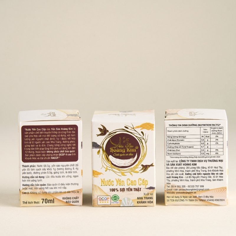 Yến Sào Hoàng Kim - Thức Uống Giải Khát & Bồi Bổ Tinh Tế Từ Thiên Nhiên Nước Yến Cao Cấp Hoàng Kim là sự kết hợp hoàn hảo giữa nguồn yến sào bổ dưỡng và hương thơm thanh mát đặc trưng của lá dứa tươi tự nhiên. Đây không chỉ là một thức uống giải khát thông thường, mà còn là một phương pháp tiện lợi để bổ sung năng lượng và các dưỡng chất cần thiết cho cơ thể mỗi ngày. Điểm Vượt Trội Của Sản Phẩm: -     Hương Vị Thanh Mát Độc Đáo: Sự hòa quyện của yến sào, vị ngọt dịu của đường phèn và hương thơm thanh tao từ lá dứa tươi tạo nên một thức uống thơm ngon, hấp dẫn và hoàn toàn tự nhiên. -     Chất Lượng OCOP 4 Sao Được Chứng Nhận: Sản phẩm đạt chứng nhận OCOP 4 sao của tỉnh Khánh Hòa năm 2024, đảm bảo người tiêu dùng được sử dụng một sản phẩm uy tín, chất lượng. -     Sản Xuất Theo Tiêu Chuẩn Quốc Tế HACCP: Quy trình sản xuất khép kín, hiện đại, đạt chuẩn HACCP, cam kết không chất bảo quản, an toàn cho sức khỏe. -     Giải Pháp Bồi Bổ Nhanh Chóng, Tiện Lợi: Sản phẩm được đóng chai tiện dụng, dễ dàng mang theo và thưởng thức mọi lúc mọi nơi, giúp bạn nạp năng lượng tức thì. Thông Tin Chi Tiết Sản Phẩm: Thương hiệu: Yến Sào Hoàng Kim Xuất xứ: Việt Nam Thành phần: Nước (68.5g), yến sào nguyên chất (1g yến khô, tương đương 8.4g yến tươi), đường phèn (5.5g), gừng tươi, lá dứa tươi. Đối tượng sử dụng: Phù hợp với mọi lứa tuổi, đặc biệt là người bận rộn, học sinh, sinh viên cần sự tỉnh táo. Hướng dẫn sử dụng: Lắc đều trước khi uống, ngon hơn khi uống lạnh. Nên dùng hết sau khi mở nắp. Hạn sử dụng: 12 tháng.