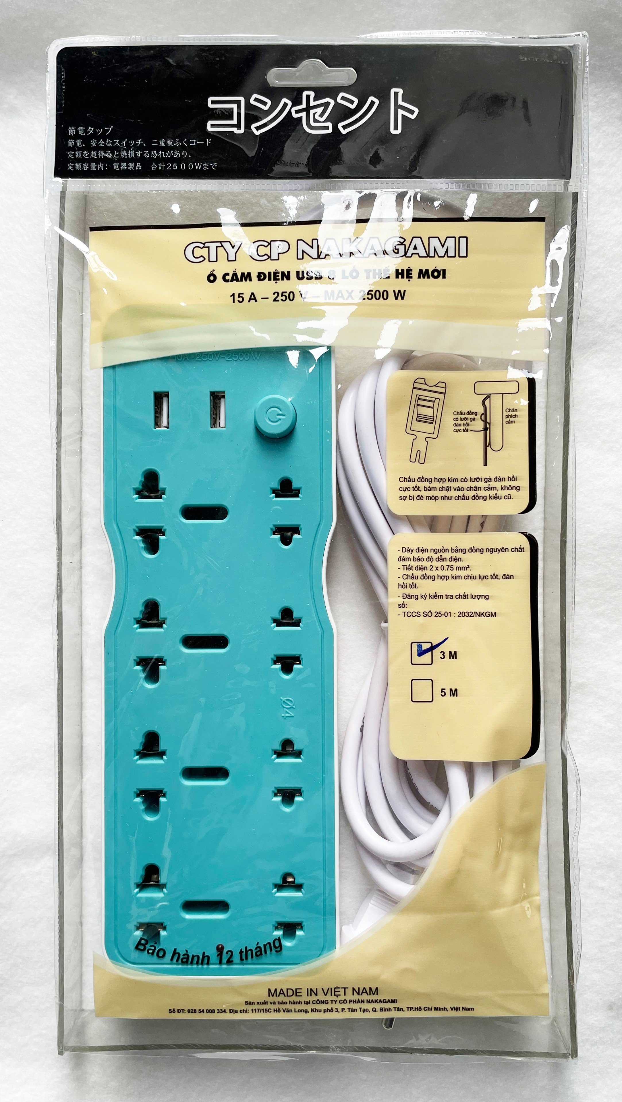 Ổ cắm điện đa năng 8 lỗ công tắc tự ngắt Nakagami công nghệ Nhật Bản dây 3m