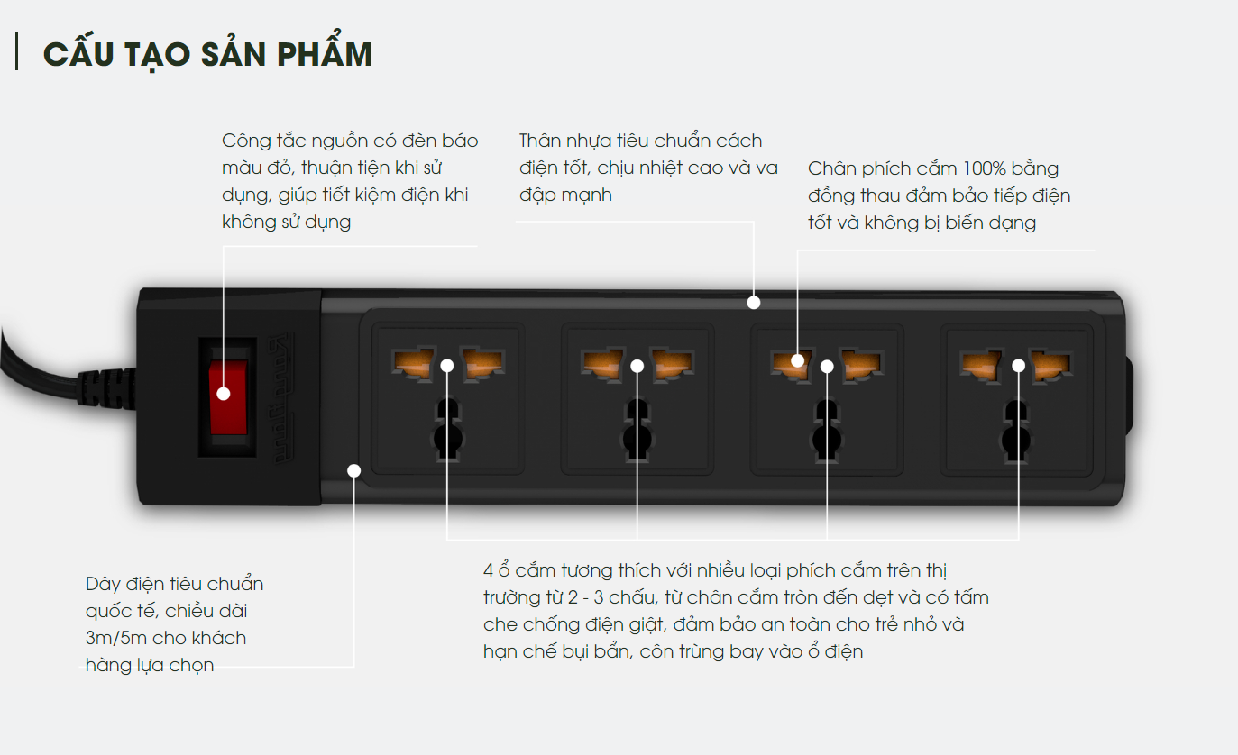 - Bảo vệ an toàn chống xung điện áp cao, xung sét. - Công tắc tích hợp rơ le chống quá tải 15A. - Ổ cắm đa năng sử dụng đồng chuyên dụng siêu đàn