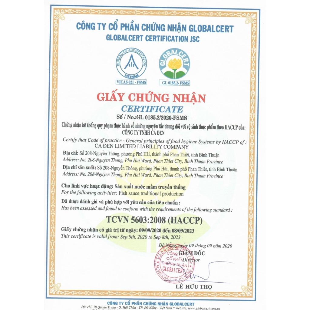 Nước Mắm Cá Đen Phan Thiết đạt chứng nhận tiêu chuẩn HACCP ( tiêu chuẩn VSATTP Châu Âu), OCOP 4 SAO (hạng mục tỉnh Bình Thuận), có giấy phép kiểm định của viện Pasteur HCM