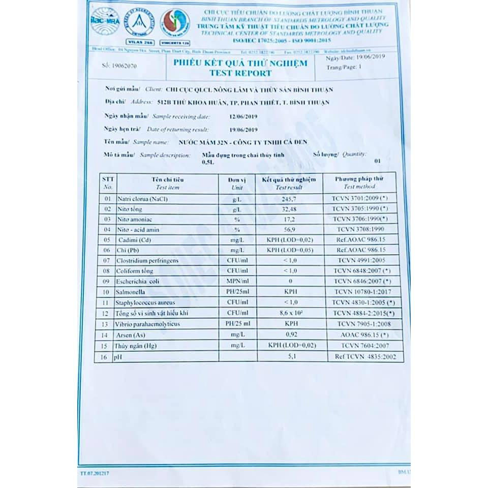 Nước Mắm Cá Đen Phan Thiết đạt chứng nhận tiêu chuẩn HACCP ( tiêu chuẩn VSATTP Châu Âu), OCOP 4 SAO (hạng mục tỉnh Bình Thuận), có giấy kiểm định chất lượng của viện Pasteur HCM