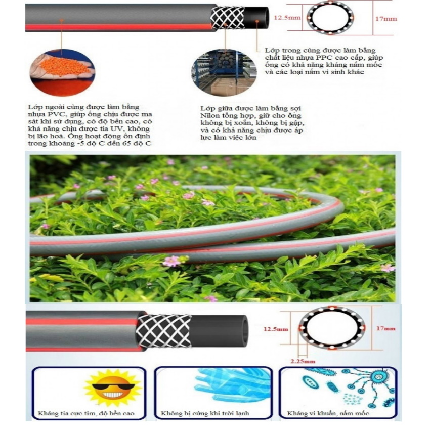 Ống kết cấu 3 lớp Chống gập, chống xoắn ống Không bị cứng ống khi thời tiết lạnh Kháng tia cực tím, độ bền cao Kháng vi khuẩn, nấm mốc Có các loại 5m,10m,15m,20m,25m.... phù