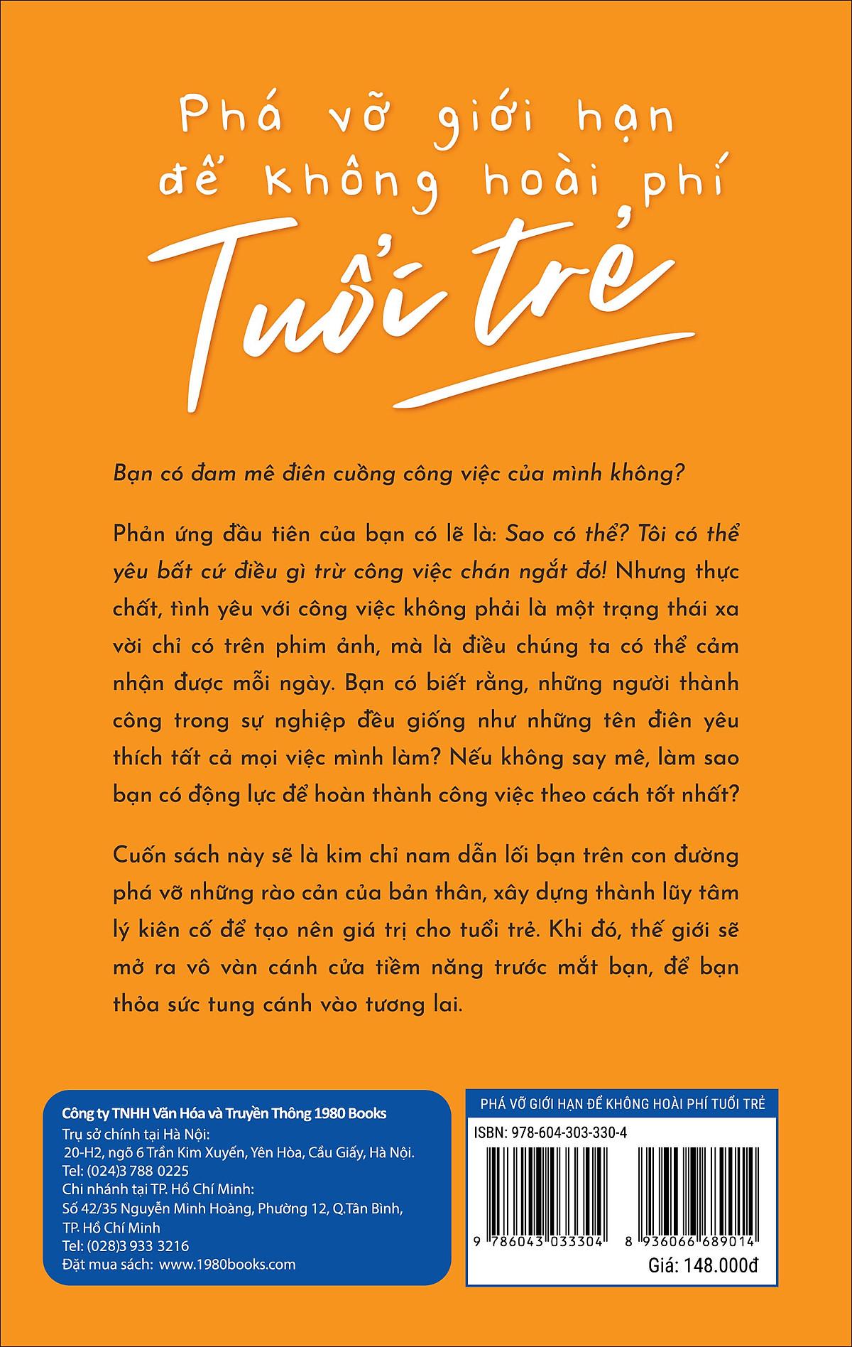 “Bạn có đam mê điên cuồng công việc của mình không?” Phản ứng đầu tiên của rất nhiều người có lẽ là: Sao có thể? Tôi có thể yêu bất cứ điều gì trừ công việc chán ngắt đó! Hoặc là “Yêu thích gì chứ, tôi làm việc chỉ vì tiền thôi”. Khoan đã nào, tình yêu với công việc không phải là một trạng thái xa vời chỉ có trên phim ảnh, đấy là điều chúng ta có thể cảm nhận được mỗi ngày. Bạn có biết rằng, những người đạt được thành công trong sự nghiệp đều giống như những tên điên yêu thích tất cả mọi việc mình làm? Nếu không say mê, làm sao bạn có động lực để hoàn thành công việc tốt nhất? Thông qua những câu chuyện có thật xen lẫn hư cấu, Phá vỡ giới hạn để không hoài phí tuổi trẻ đặt ra các khía cạnh của việc thiết lập tầm nhìn, mục tiêu vững chắc trong công việc. Đồng thời, cuốn sách còn là kim chỉ nam dẫn lối, là một sự chuẩn bị cho tâm lý và phương pháp hiệu quả cho những người trẻ trên con đường phá vỡ những rào cản của bản thân, xây dựng thành lũy tâm lý kiên cố để tạo nên giá trị cho tuổi trẻ. Khi đó, thế giới sẽ mở ra vô vàn cánh cửa tiềm năng trước mắt bạn, để bạn thỏa sức tung cánh vào tương lai. “Nếu như một người trẻ tuổi không thể phát hiện ra bất kỳ cơ hội nào trong công việc và cuộc sống để cho rằng bản thân có thể làm tốt hơn, vậy thì thất bại thảm hại với người đó chỉ là sớm hay muộn mà thôi.”- Augson Madden – Về tác giả: Trần Vĩnh Quân, nam, nhà văn trẻ mới nổi có tác phẩm bán chạy trên dangdang. Là một người trẻ tuổi, nhiệt huyết, Trần Vĩnh Quân đã thực hiện nhiều chương trình thảo luận về chủ đề phát triển và thành công cho giới trẻ hiện nay. Trần Vĩnh Quân cũng là tác giả của nhiều bài viết về năng lượng tích cực trên nhiều tờ báo nổi tiếng được độc giả hoan nghênh.