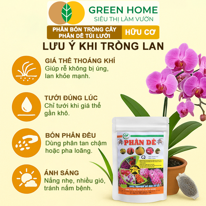 -Phân dê là một loại phân chuồng có hàm lượng cân đối nên rất tốt cho lan. Phân dê đã được xử lý bằng nấm Trichoderma và phơi khô, dạng viên tròn không bị vỡ vụn. Thành phần chính yếu nhất của phân dê là chất hữu cơ, khoáng NPK và các loại khoáng trung – vi lượng thiết yếu giúp lan sinh trương mạnh.