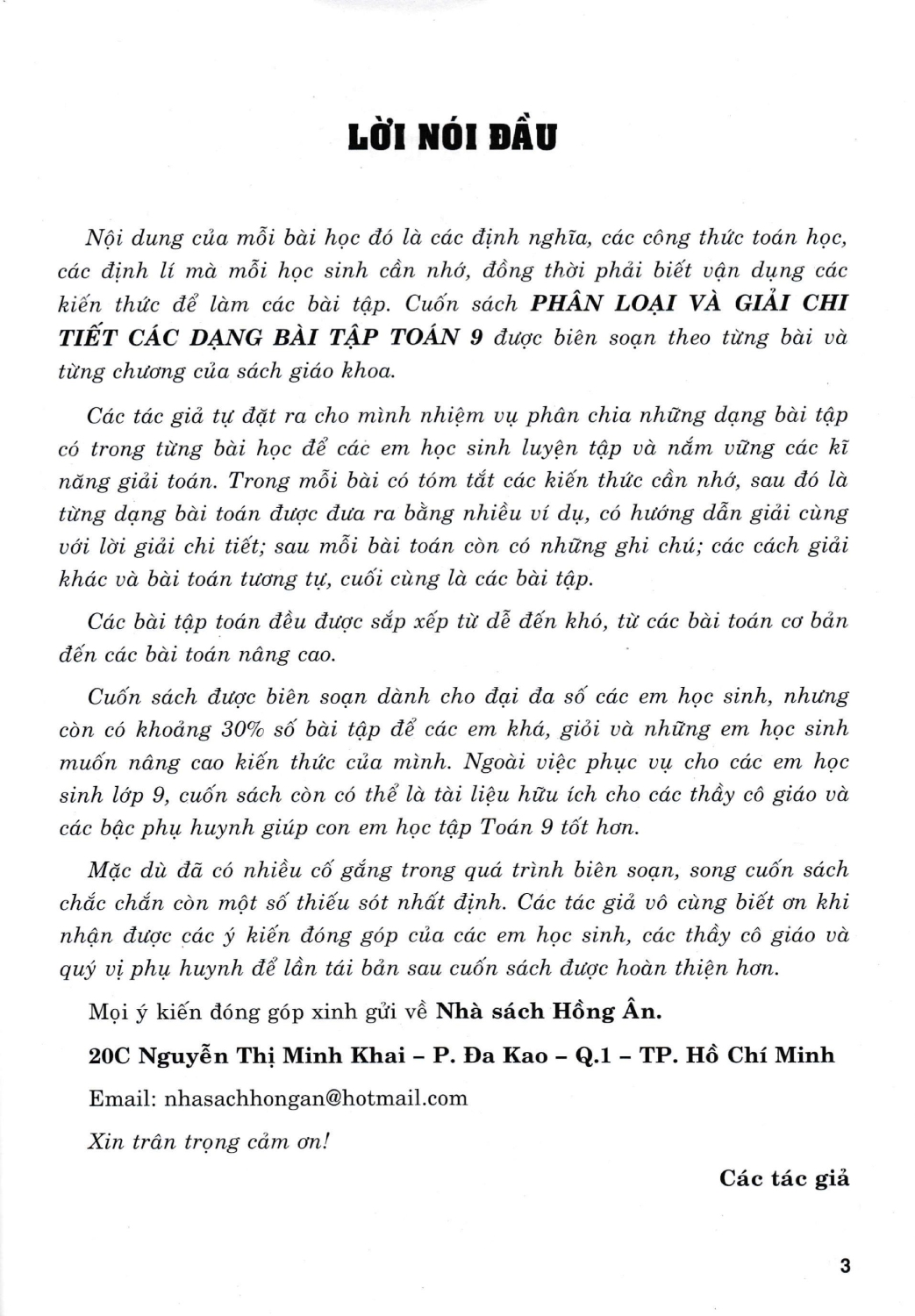 Cuốn sách được biên soạn dành cho đại đa số các em học sinh, nhưng còn có khoảng 30% số bài tập để các em khá, giỏi và những em học sinh muốn nâng cao kiến thức của mình. Ngoài việc phục vụ cho các em học sinh lớp 9, cuốn sách còn có thể là tài liệu hữu ích cho các thầy cô giáo và các bậc phụ huynh giúp con em học tập Toán 9 tốt hơn.