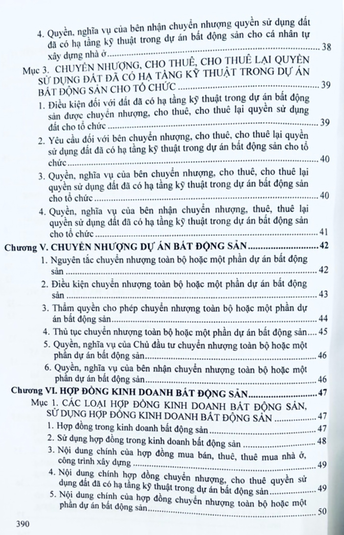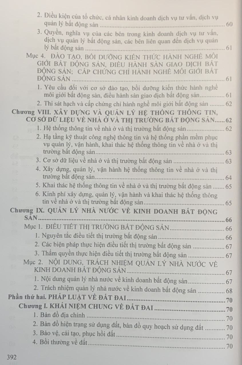 (Khái niệm chung về kinh doanh bất động sản; Kinh doanh nhà ở, công trình xây dựng có sẵn; Kinh doanh nhà ở, công trình xây dựng hình thành trong tương lai; Kinh doanh quyền sử dụng đất đã có hạ tầng kỹ thuật trong dự án bất động sản; Chuyển nhượng dự án bất động sản; Hợp đồng kinh doanh bất động sản; Kinh doanh dịch vụ bất động sản và đào tạo, bồi dưỡng, cấp chứng chỉ hành nghề trong kinh doanh dịch vụ bất động sản; Xây dựng và quản lý hệ thống thông tin, cơ sở dữ liệu về nhà ở và thị trường bất động sản; Quản lý nhà nước về kinh doanh bất động sản