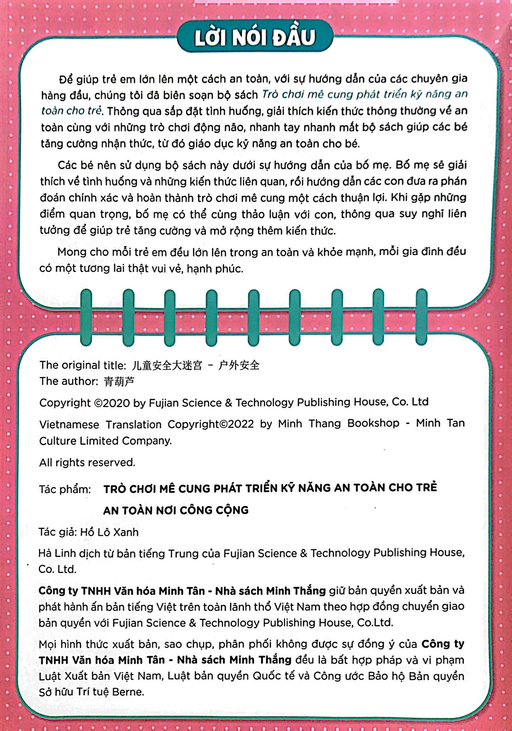 Để giúp trẻ em lớn lên một cách an toàn, với sự hướng dẫn của các chuyên gia hàng đầu, chúng tôi đã biên soạn bộ sách "Trò chơi mê cung phát triển kỹ năng sin toàn cho trẻ" .Thông qua sắp đặt tình huống, giải thích kiến thức thông thường về an toàn cùng với những trò chơi động não, nhanh tay nhanh mắt bộ sách giúp các bé tăng cường nhận thức, từ đó giáo dục kỹ năng an toàn cho bé.