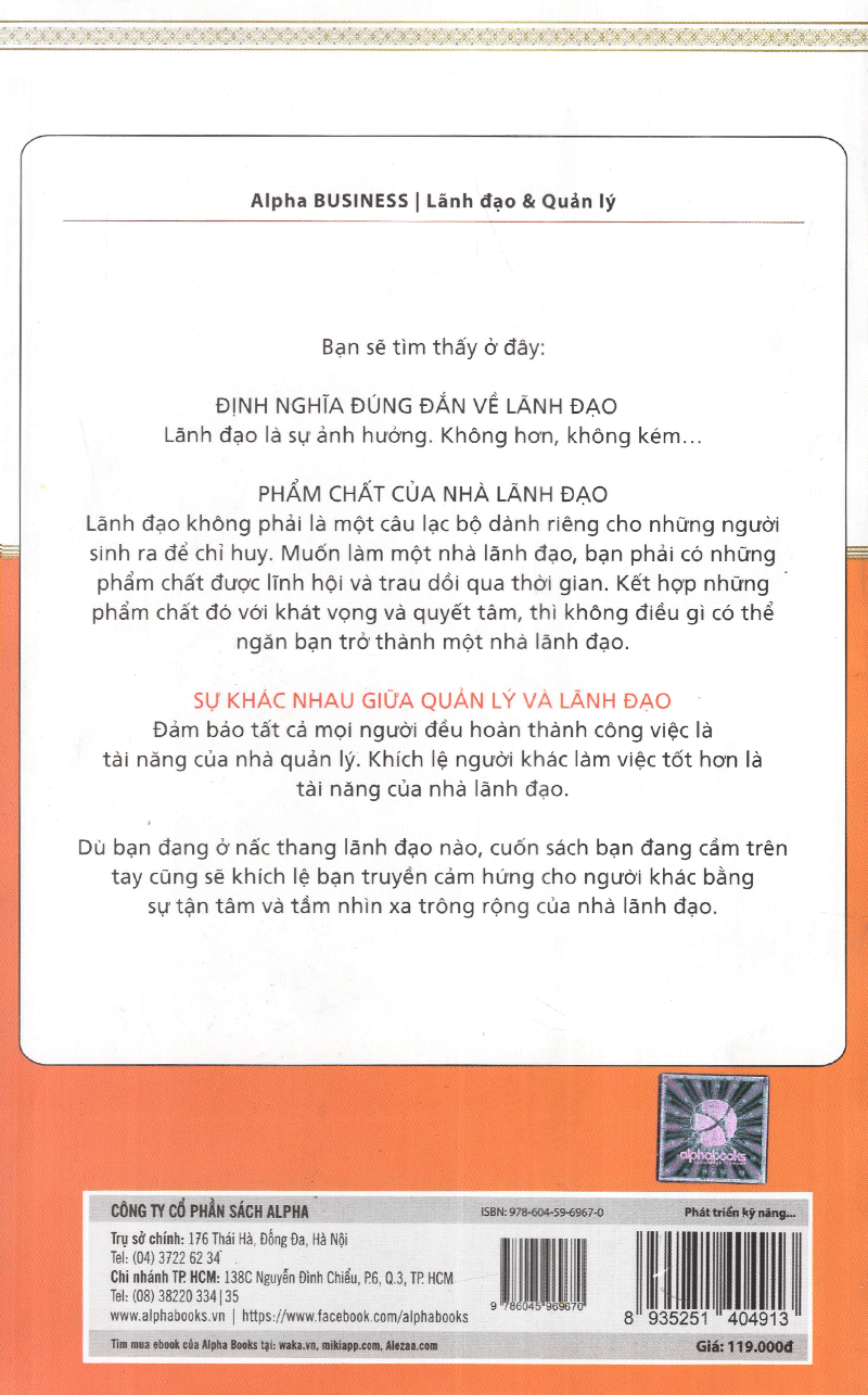 Dù bạn đang ở nấc thang lãnh đạo nào, cuốn sách bạn đang cầm trên tay cũng sẽ khích lệ bạn truyền cảm hứng cho người khác bằng sự tận tâm và tầm nhìn xa trông rộng của nhà lãnh đạo .