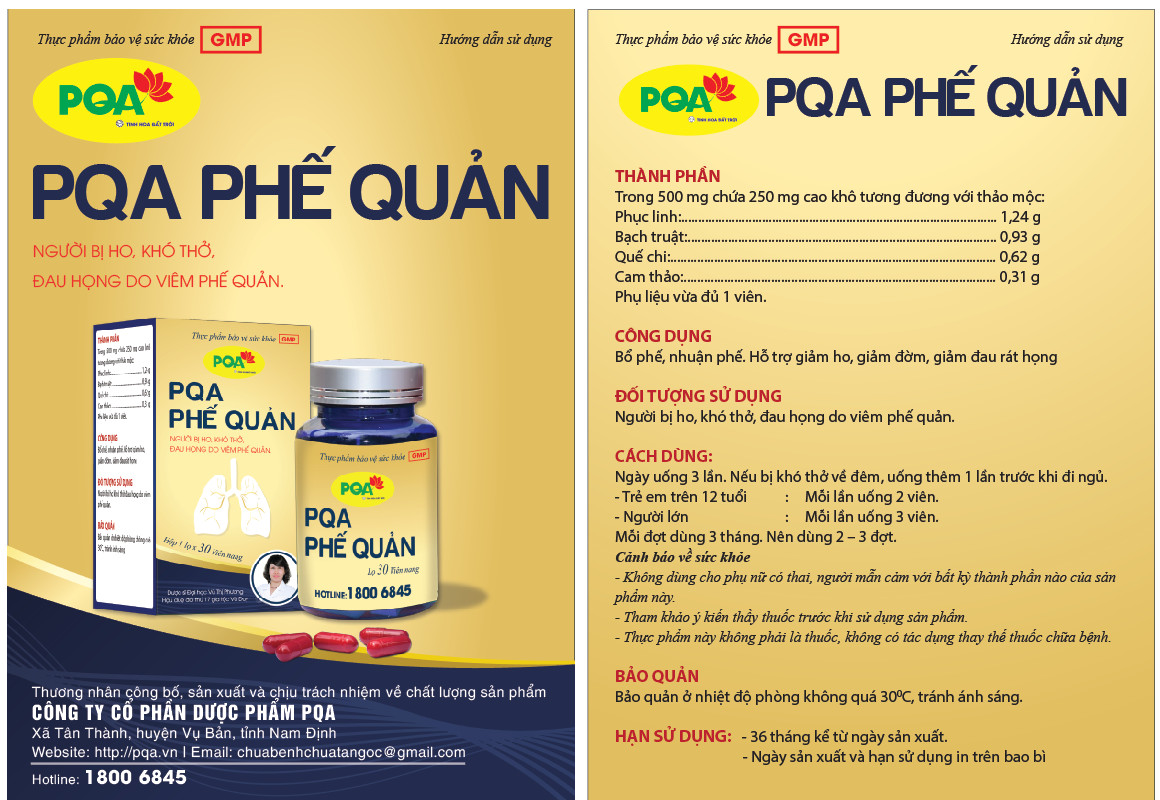 - Địa chỉ sản xuất: Công ty Cổ phần Dược phẩm PQA. Thửa 99, Khu Đồng Quàn, Xã Tân Thành, Huyện Vụ Bản, Tỉnh Nam Định. THÀNH PHẦN: