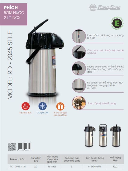 Phích Bơm nước Rạng Động Độ giữ nhiệt cao sau 6 giờ ≥ 80°C