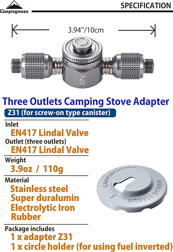 - Trọng lượng: 110g Phụ kiện đầu chuyển đổi bình gas mini Campingmoon Z31 gồm 1 ống nối đựng nhiên liệu ra 3 thiết bị (sản phẩm chỉ bao gồm bộ chuyển đổi Z31, không bao gồm bình gas) Đầu vào: EN417 Van Lindal (hộp kiểu vặn vít); Đầu ra: ba van Lindal EN417 Được trang bị van một chiều (van tự làm kín) & vòng chữ O, do đó nó sẽ không bị rò rỉ khi kết nối với bình gas. KẾT NỐI DỄ DÀNG: Xoay 360 độ ở phích cắm bên hông giúp bạn dễ dàng vặn vào.