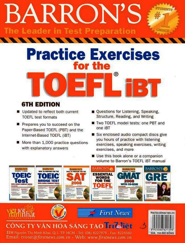 Practice Exercises for the TOEFL, 6 edition với 6 Audio CDs là ấn bản mới nhất của NXB Barron’s trong đề tài này. Bộ tài liệu ấn bản lần thứ 6 này ra mắt độc giả năm 2008 với nhiều dạng bài tập thực hành cập nhật dành cho các kỳ thi TOEFL iBT. Sách nên được sử dụng kèm với cuốn Barron’s TOEFL iBT - How to Prepare for the TOEFL iBT (First News đã phát hành).