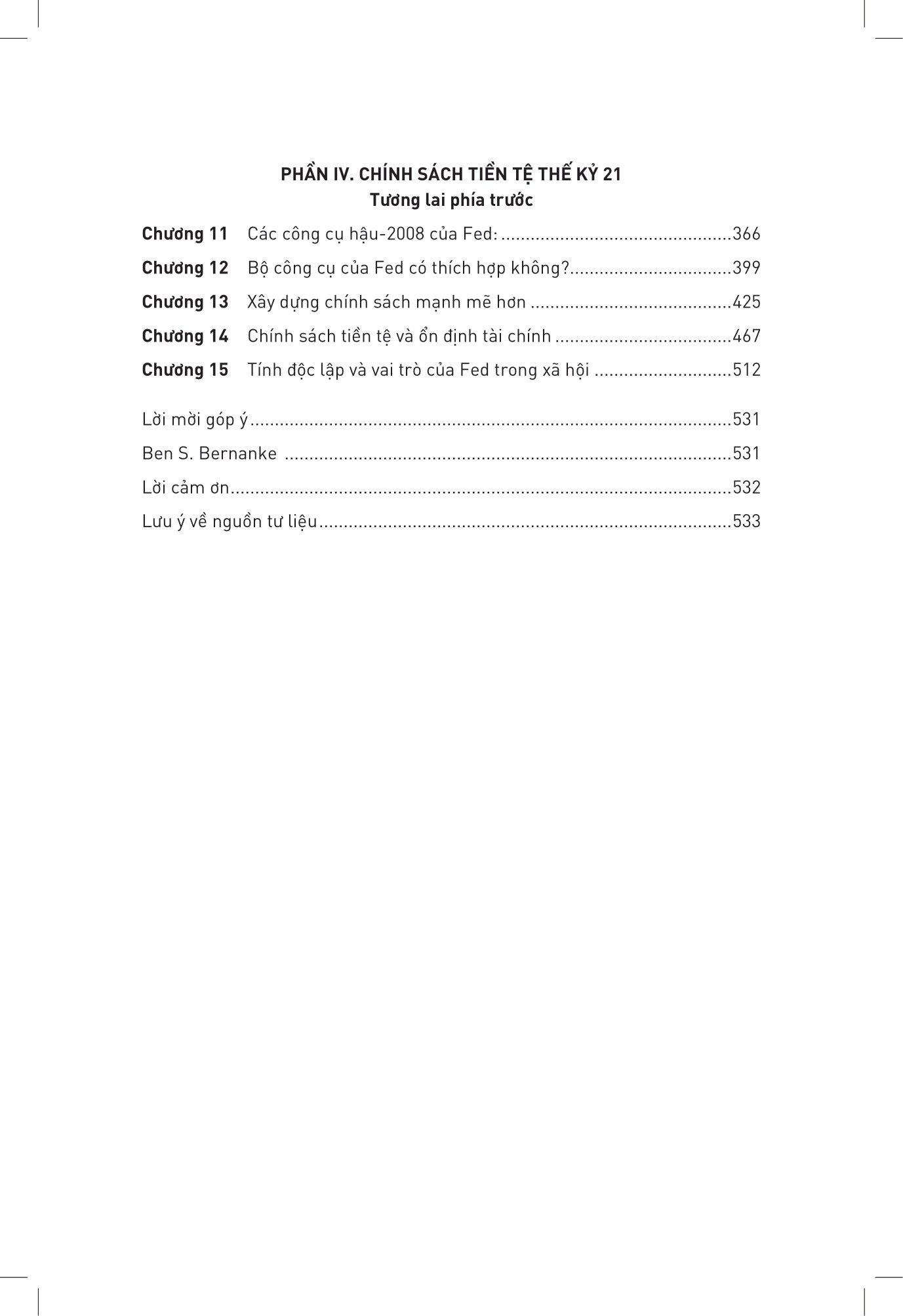 Ngoài việc giải thích các công cụ hoạch định chính sách mới của hệ thống ngân hàng trung ương, cuốn sách còn kể về những khoảnh khắc kịch tính mà với đó, các quyết định của Fed dưới triết lý của những người từng chèo lái tổ chức này - đã tạo nên nhiều tác động đáng kể. Sách gồm 4 phần: