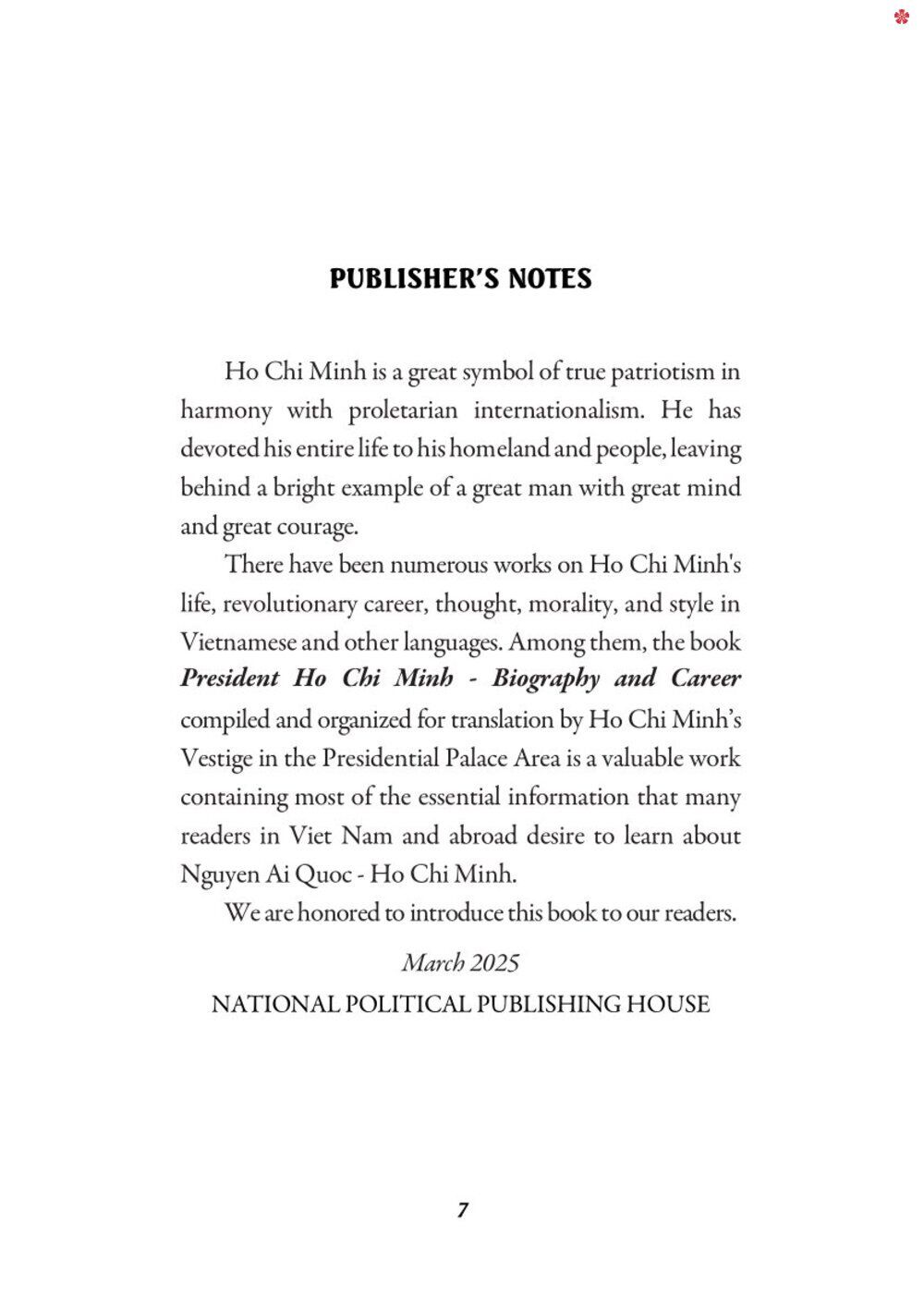 Ho Chi Minh is a great symbol of true patriotism in harmony with proletarian internationalism. He has devoted his entire life to his homeland and people, leaving behind a bright example of a great man with great mind and great courage. There have been numerous works on Ho Chi Minh's life, revolutionary career, thought, morality, and style in Vietnamese and other languages. Among them, the book President Ho Chi Minh - Biography and Career compiled and organized for translation by Ho Chi Minh’s Vestige in the Presidential Palace Area is a valuable work containing most of the essential information that many readers in Viet Nam and abroad desire to learn about Nguyen Ai Quoc - Ho Chi Minh.