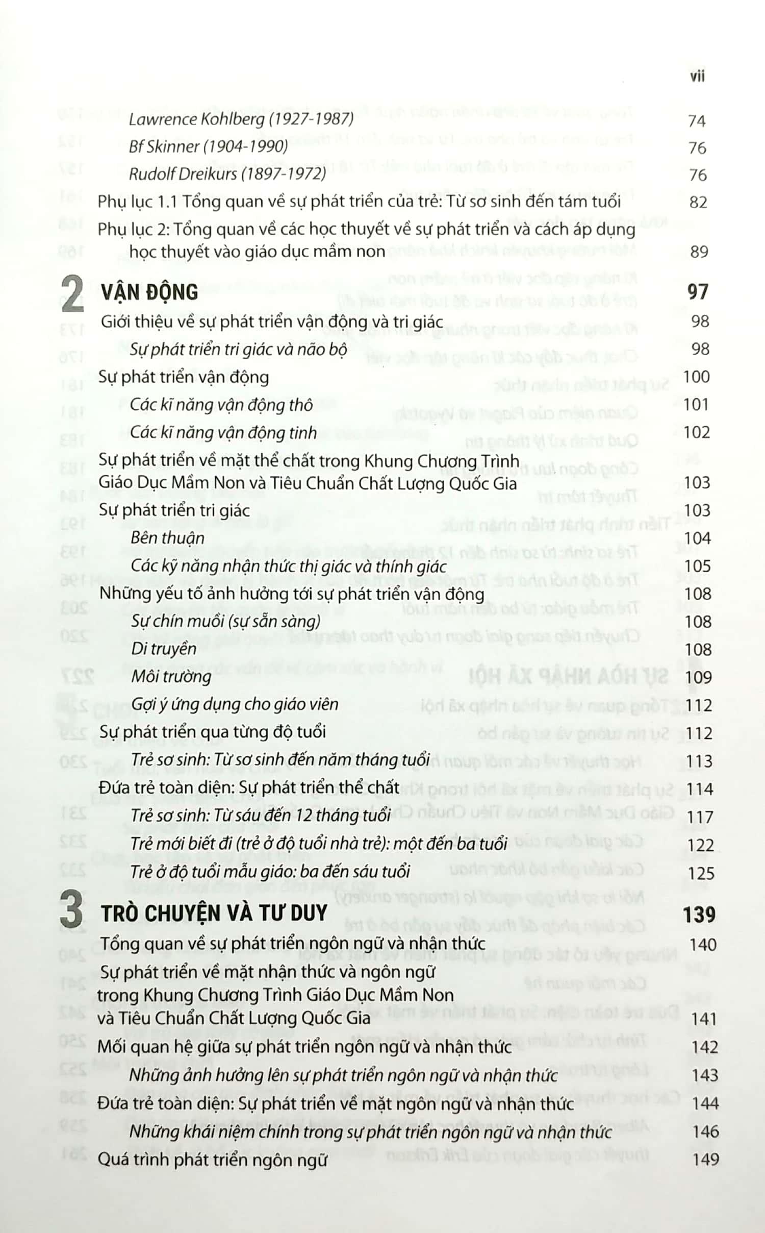 Các chương 2, 3, 4 trình bày một nền tảng kiến thức hoàn thiện về sự phát triển thể chất, ngôn ngữ, nhận thức và xã hội ở trẻ. Tôi đã cố gắng diễn đạt những kiến thức qua khái niệm đứa trẻ toàn diện, nhằm thúc đẩy một hiểu biết toàn diện về mối tương quan thiết yếu giữa các lĩnh vực phát triển khác nhau, và tầm quan trọng của sự phát triển trong mối liên hệ với bối cảnh văn hóa xã hội của trẻ.