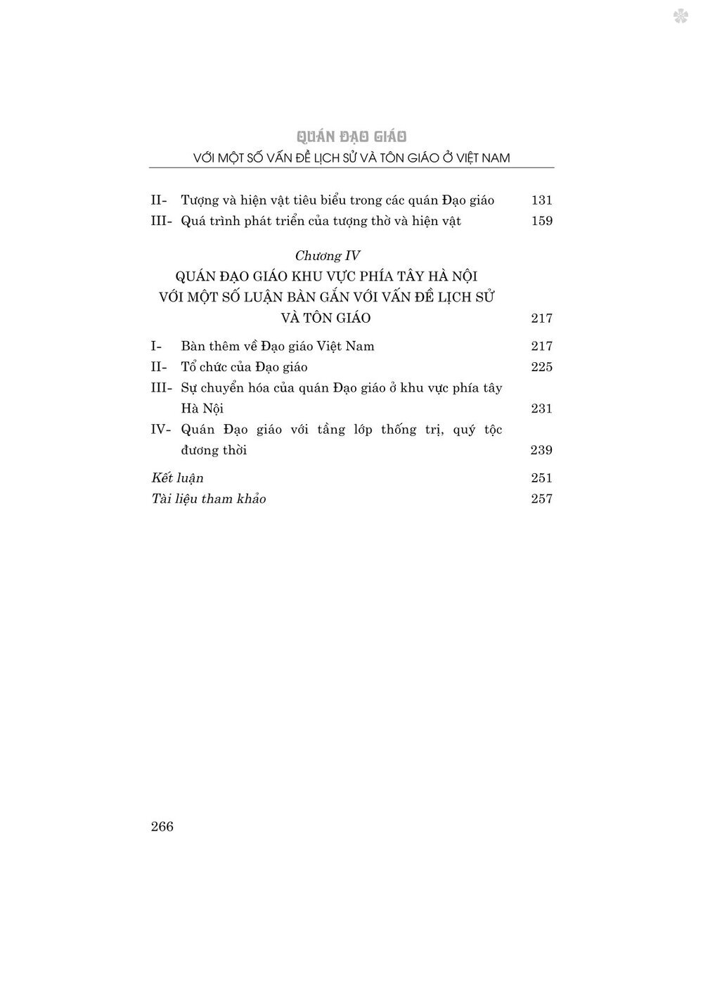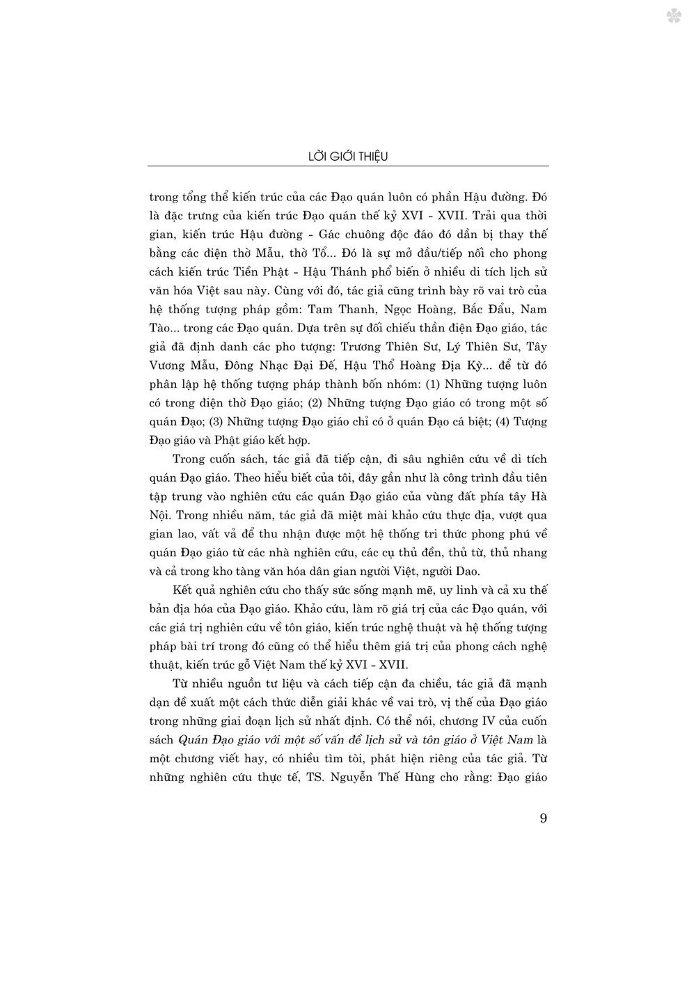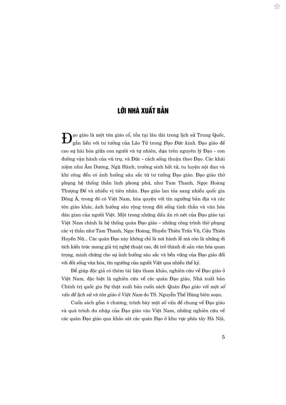 Để giúp độc giả có thêm tài liệu tham khảo, nghiên cứu về Đạo giáo ở Việt Nam, đặc biệt là nghiên cứu về các quán Đạo giáo, Nhà xuất bản Chính trị quốc gia Sự thật xuất bản cuốn sách Quán Đạo giáo với một số vấn đề lịch sử và tôn giáo ở Việt Nam do TS. Nguyễn Thế Hùng biên soạn. Cuốn sách gồm 4 chương, trình bày một số vấn đề chung về Đạo giáo và quá trình du nhập của Đạo giáo vào Việt Nam, những nghiên cứu về các quán Đạo giáo qua khảo sát các quán Đạo ở khu vực phía tây Hà Nội, thể hiện đặc trưng về kiến trúc, hiện vật tiêu biểu có trong các quán Đạo giáo; quán Đạo giáo ở khu vực phía tây Hà Nội và một số vấn đề về lịch sử và tôn giáo...