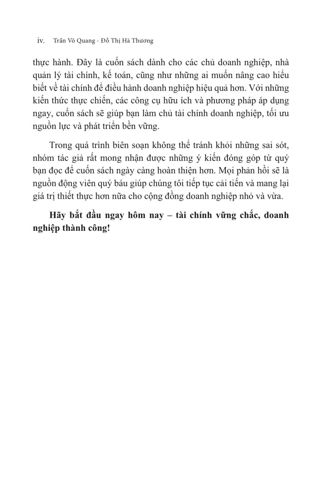 Cuốn sách này được xây dựng theo một lộ trình rõ ràng, từ việc chuẩn hóa dữ liệu và hệ thống kế toán, hiểu các nguyên tắc tài chính trong kinh doanh, đến hướng dẫn đọc, hiểu báo cáo tài chính và phân tích tài chính để đưa ra các quyết định chính xác. Tiếp theo, bạn sẽ học cách cải thiện báo cáo tài chính, quản lý chi phí và phân tích điểm hòa vốn, nhằm tối ưu lợi nhuận. Bên cạnh đó, cuốn sách giúp bạn lập kế hoạch dòng tiền, đảm bảo doanh nghiệp không còn nỗi lo thiếu tiền. Cuối cùng, cuốn sách cung cấp các công cụ và checklist thực tế, dễ áp dụng cho các doanh nghiệp nhỏ và vừa, giúp bạn áp dụng nhanh chóng các kiến thức tài chính vào thực tiễn nhằm nâng cao hiệu quả quản lý tài chính trong doanh nghiệp.