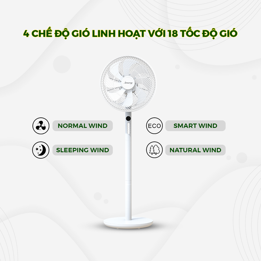 Dreamer DHA SSF136 | Quạt thông minh điều khiển giọng nói, 18 tốc độ, 4 chế độ gió, 3 dáng quạt