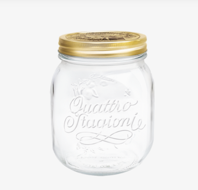 Nắp đậy màu vàng đồng nổi bật có in logo, thiết kế dạng xoay giúp đậy kín và cách ly thực phẩm khỏi bụi bẩn. Phần thân hũ cách điệu với logo Quattro Stagioni in nổi trên thân thủy tinh vừa đẹp mắt vừa có công dụng chống trơn trượt và làm nổi bật sự tinh tế mang đậm phong cách Ý