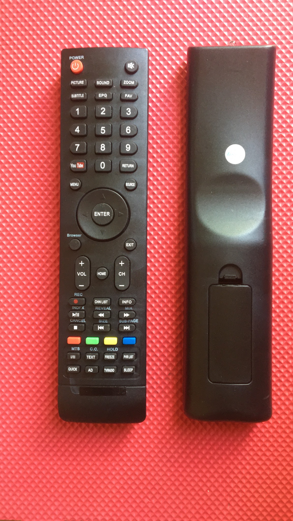 Hàng mới 100%, được PRC sản xuất với công nghệ tiên tiến Nguồn: 2 viên pin AAA Khoảng cách sử dụng: 8m Kích thước: 2415125mm Trọng lượng: 113g 1.POWER:Nhấn để bật tivi hoặc cho về chế độ chờ 2. MUTE:Nhấn để tắt tiếng hoặc bật tiếng tivi 3. PICTURE:Thay đổi chế độ hình ảnh trên tivi 4. SOUND:Thay đổi chế độ âm thanh trên tivi 5. ZOOM:Thay đổi tỷ lệ hình ảnh trên tivi 6. SUBTITLE:Bật/Tắt phụ đề ở chế độ DTV/USB 7. EPG:Nhấn để hiển thị thông tin EPG trên tivi Trong đó:EPG (Electronic Programme Guide) là giao diện đồ họa cung cấp thông tin trên màn hình cho khách hàng về danh sách các kênh truyền hình, thông tin chi tiết và ngắn gọn về các chương trình trên hệ thống. 8. FAV (Kênh yêu thích):Nhấn để xem các kênh yêu thích được bạn lưu lại. Nhấn các nút Lên/Xuống để chỉnh các kênh yêu thích, nhấn ENTER để xác nhận. 9.Các nút số dùng để dò kênh trực tiếp 10. CHN LIST:Nhấn để vào danh sách kênh 11.RETURN(BACK):Nhấn để quay trở lại kênh đã xem trướcHOẶC những bước đã thực hiện trước 12.MENU:Mở các tùy chọn cài đặt trong menu của tivi(Cho phép người dùng truy cập hệ thống danh mục lựa chọn như: cài đặt hình ảnh, cài đặt âm thanh, kênh, …) 13.SOURCE:Chọn chế độ nguồn đầu vào dữ liệu của tivi như: HDMI, MHL, USB, … 14. Lên/ xuống/ trái/phải:Di chuyển ô chọn 15. ENTER:Xác nhận việc chọn 16. TV/RADIO:Chuyển từ tivi sang đài phát thanh 17. EXIT:Thoát khỏi menu 18. VOL+/VOL-:Điều chỉnh tăng hoặc giảm âm lượng tivi 19.HOME:Nếu tivi của bạn không phải là Smart tivi, nút này sẽ không hoạt động.Vào giao diện trang chủ của tivi, bạn có thể lựa chọn tính năng mà bạn muốn sử dụng như Hình ảnh, Âm nhạc, Video, Trình duyệt, Thiết lập, … 20. PR+/PR-:Thay đổi kênh tivi muốn xem 21. REC:Nhấn để ghi âm chương trình hiện tại (Chỉ hoạt động ở chế độ DTV) 22. SLEEP:Chọn thời gian ngủ, chẳng hạn như 10 phút, 20 phút,… 23. INFO:Hiện thị thông tin về nguồn hiện tại. 26. NICAM:Nhấn để chọn đầu ra âm thanh mong muốn (Mono (Âm Đơn Sắc), Stereo (Âm thanh nổi), hoặc SAP) tùy thuộc vào kênh phát sóng. 29. PVR LIST:Hiển thị các danh sách tập tin ghi âm 30. QUICK:Nhấn để liệt kê một số cài đặt phổ biến để thay đổi nhanh chóng 32. 3D:Nhấn để tiếp cận chức năng 3D.Lưu ý:Nếu tivi không có chức năng 3D, nút 3D trên điều khiển sẽ không hoạt động và sẽ không được sử dụng