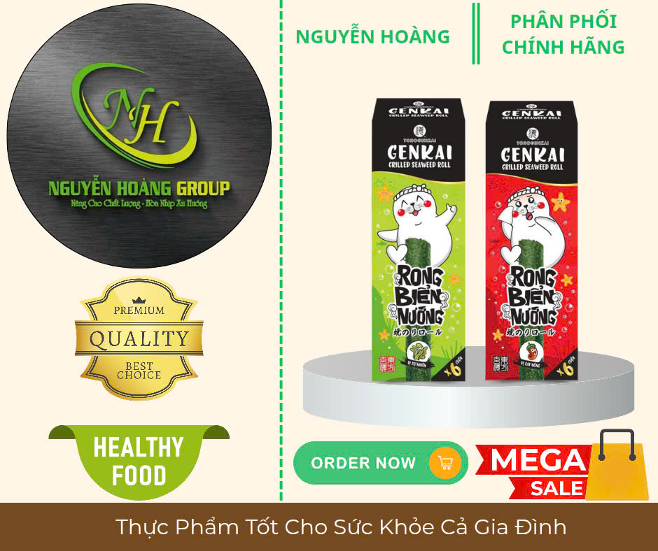 Tên sản phẩm: RONG BIỂN NƯỚNG CUỘN Có 2 Vị : Tự Nhiên & Vị Cay NÓNG -Thành phần: Rong biển 68%, dầu ngô 26.7%, dầu mè 4.3%, muối biển 1% -Lá Rong biển có màu xanh đen, lá dày, điều này thể hiện rằng hàm lượng chất dinh dưỡng của rong biển Dasolkim đảm bảo chất lượng dinh dưỡng.